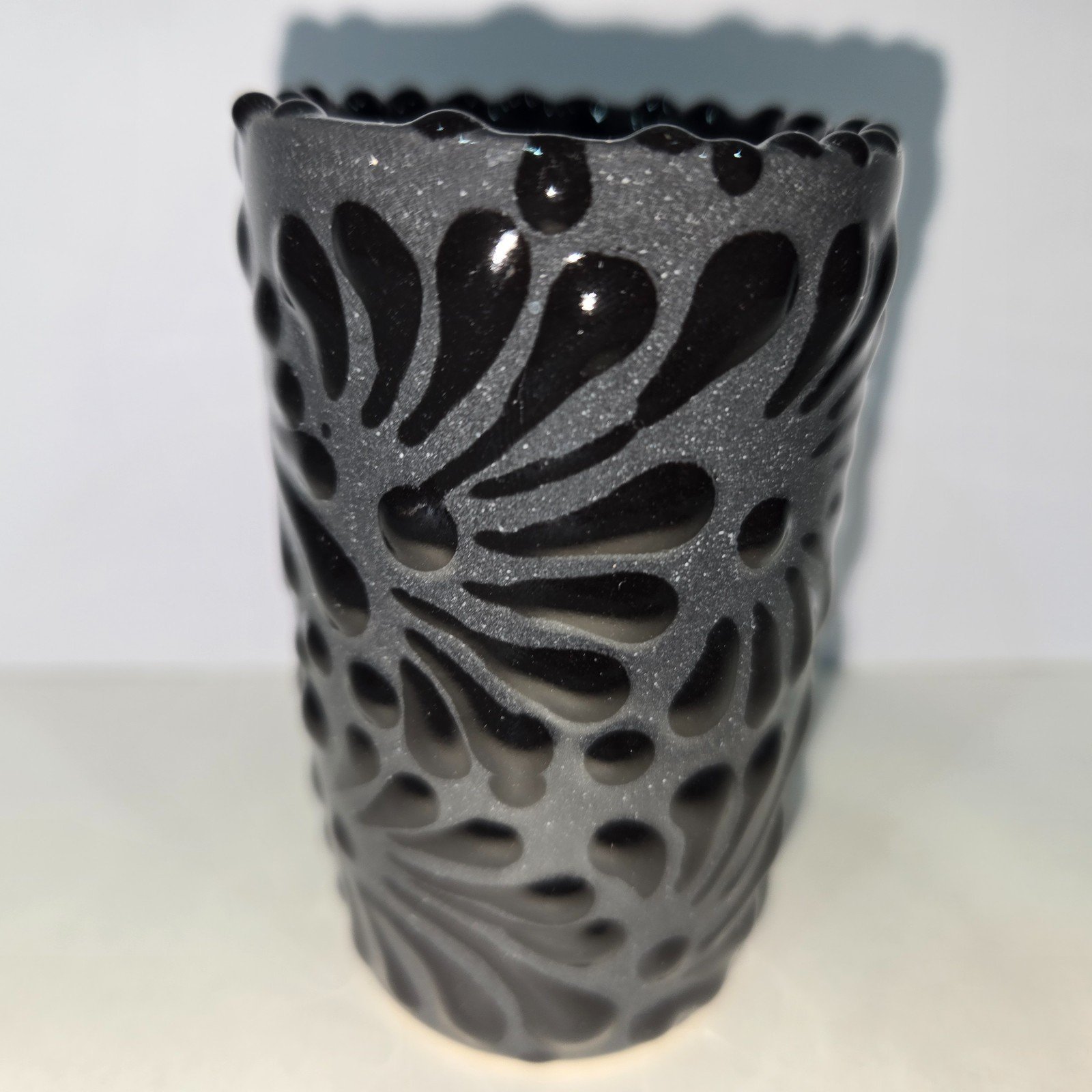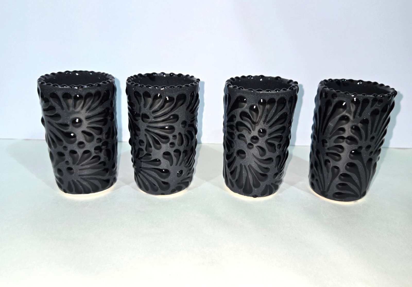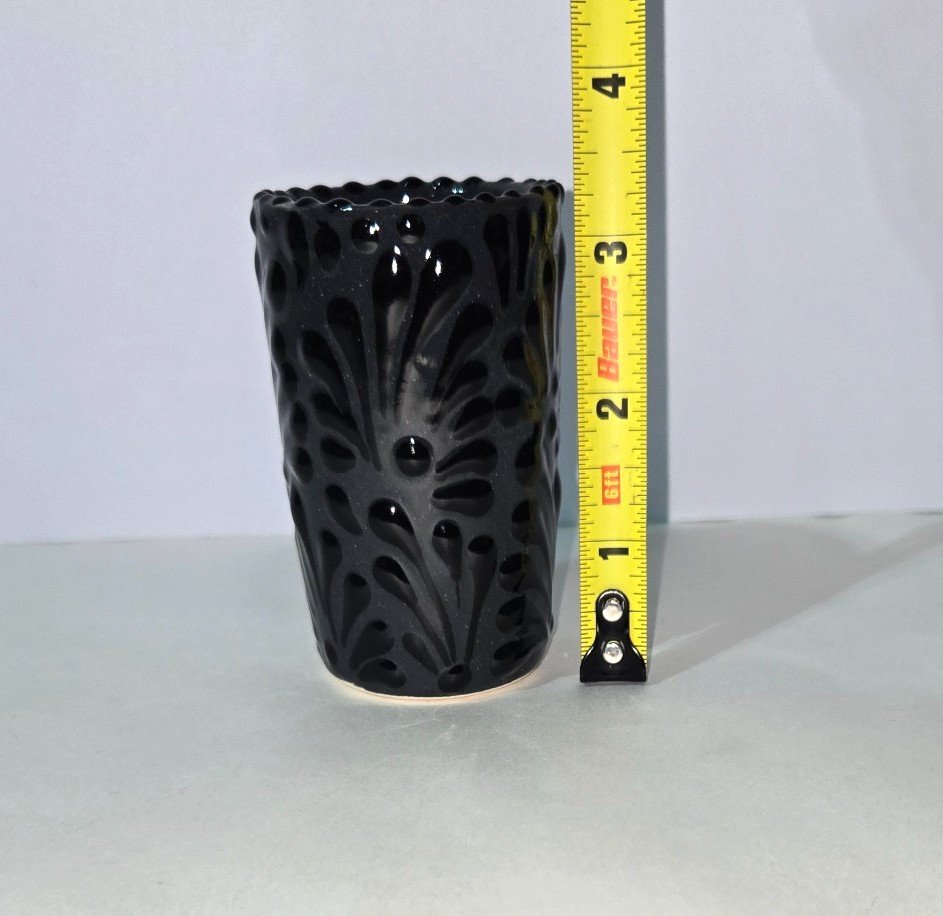 The Black Talavera Shot Glass includes one round shot glasse made of ceramic, featuring a painted Mexican art design. This handmade barware item is machine washable and suitable for all occasions, perfect for enjoying hot or cold beverages. Each shot glass has a black color and a 2-inch diameter, standing at 3.25 inches tall and weighing 3.2 oz. Imported from Mexico, these unique Talavera shot glass adds a touch of Mexican culture to your kitchen or home bar collection.