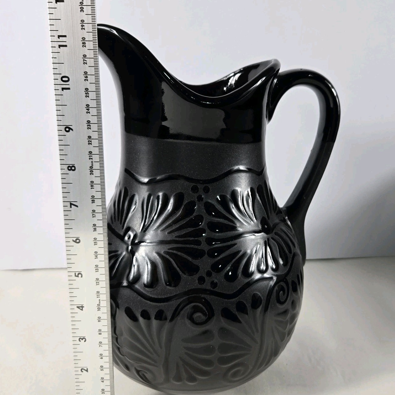 This Black Talavers Pitcher is a handcrafted Mexican art piece measuring 11.5 x 8 inches, featuring a beautiful floral pattern in a sleek black ceramic material. The pitcher is not only stylish but also functional, as it is oven safe, microwave safe, and dishwasher safe, making it ideal for all occasions in the kitchen or dining area. Hand-painted with a glossy finish, this unique piece adds a touch of elegance to any home decor, showcasing intricate craftsmanship from Mexico.
