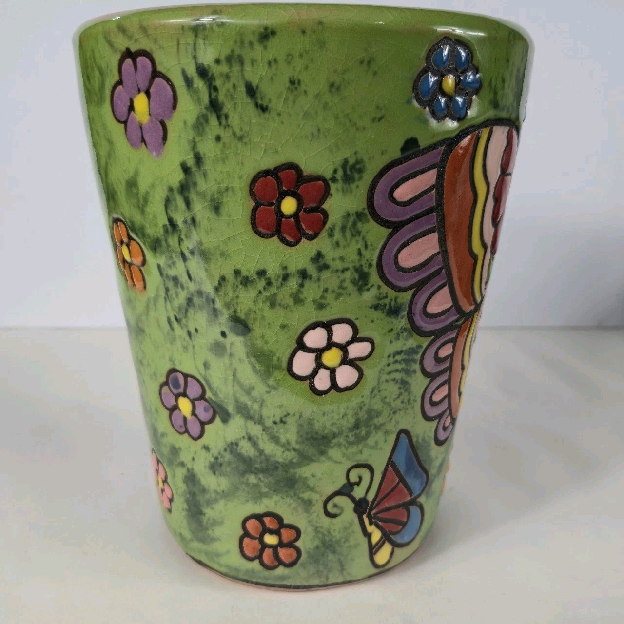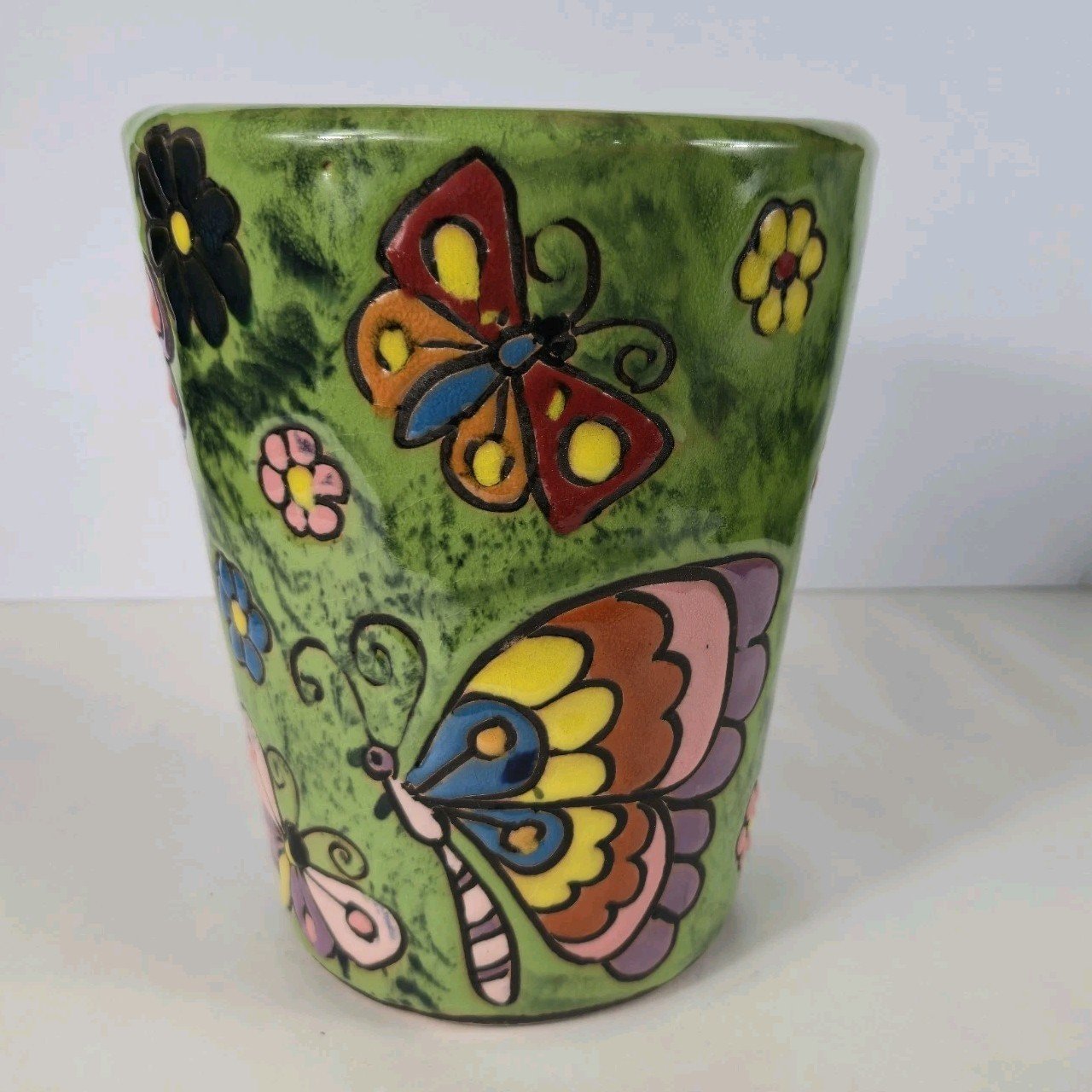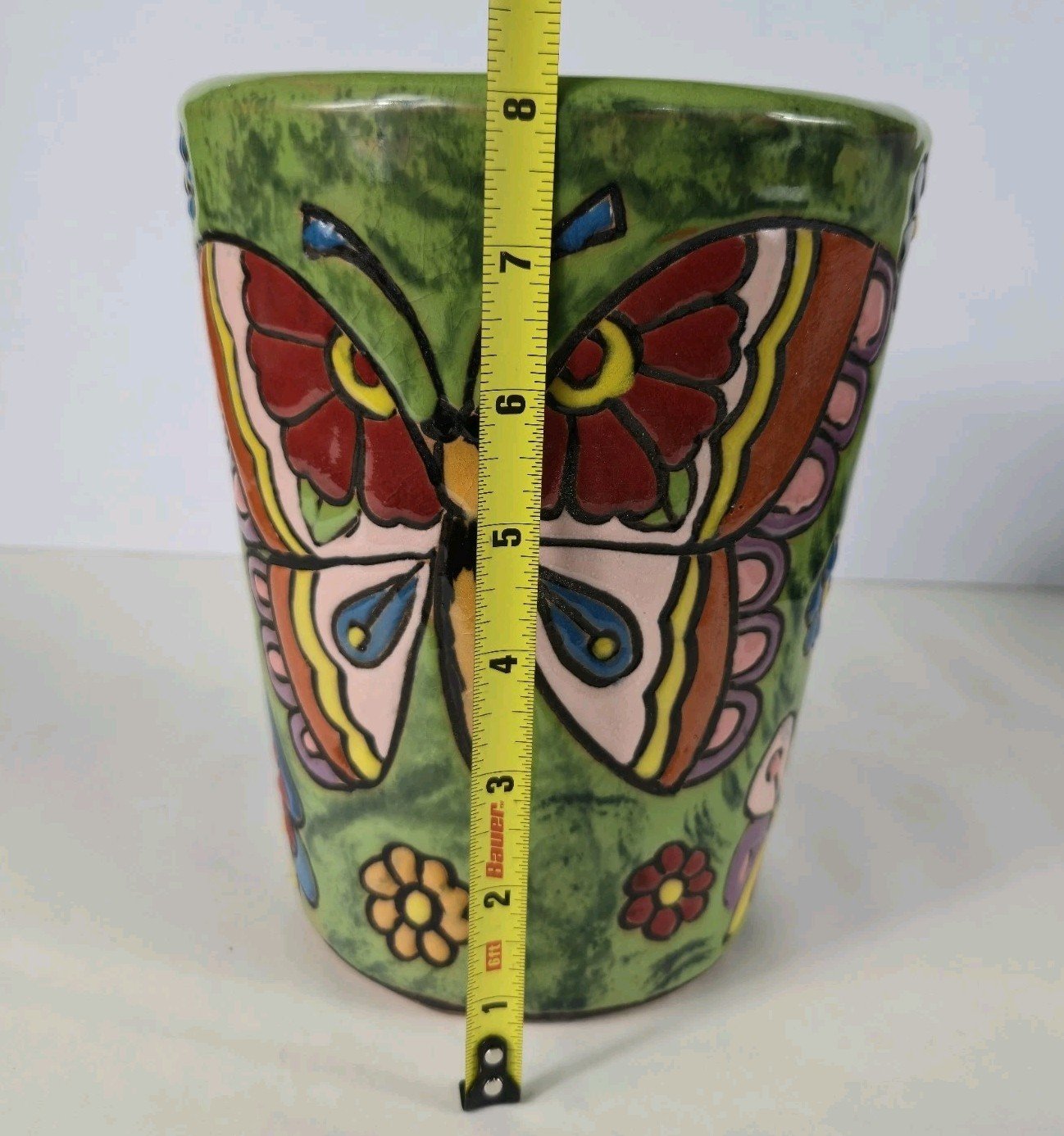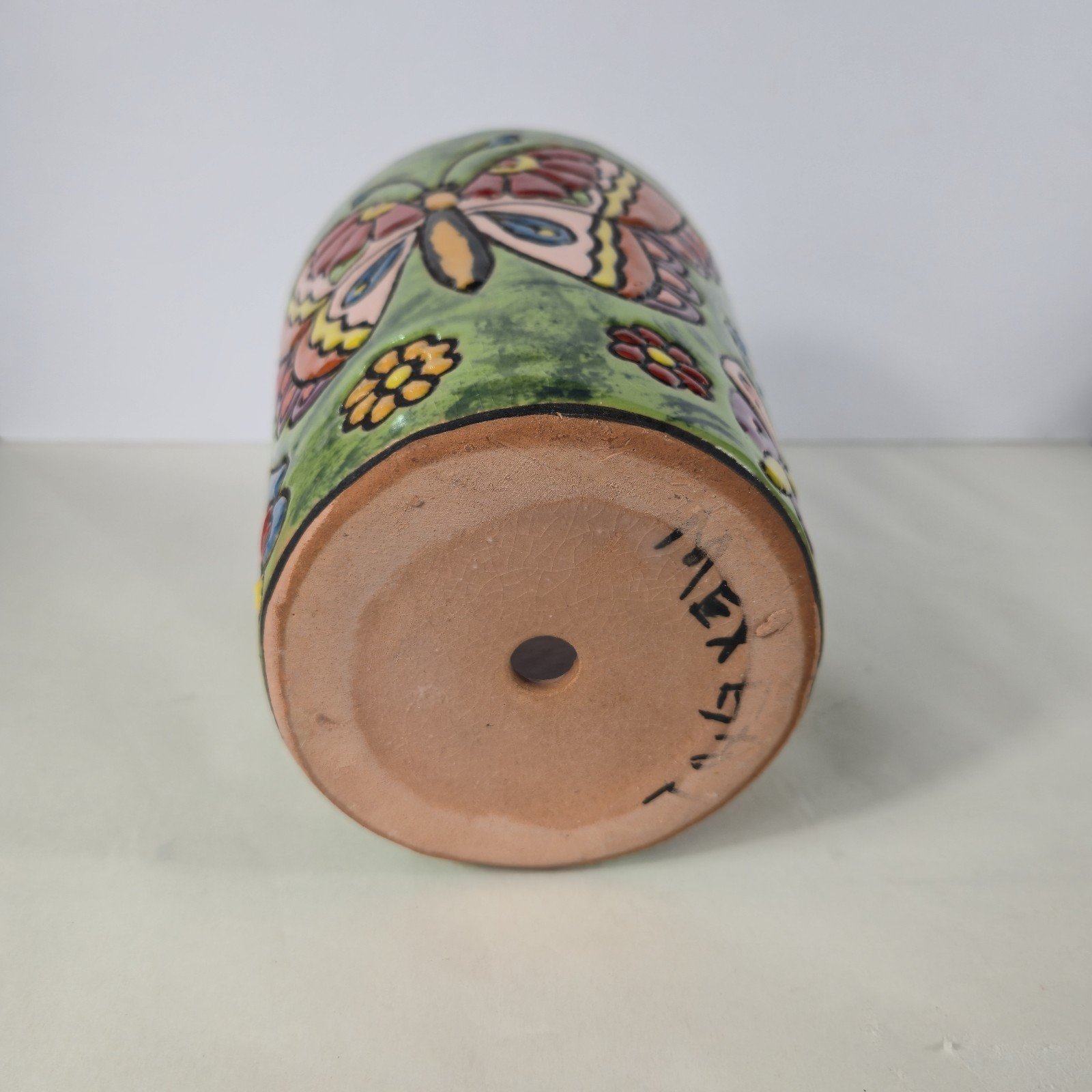 This hand-painted ceramic clay pot features a beautiful design of butterflies, adding a touch of Mexican artistry to any indoor or outdoor space. Standing at 8 inches tall and 6.5 inches wide, this pot is perfect for displaying plants and adding a unique decorative element to your home. Handmade in Mexico, this unmarked pot weighs 2.85 lbs and is painted with a relief of intricate details, making it a beautiful and authentic piece of art for your living space.