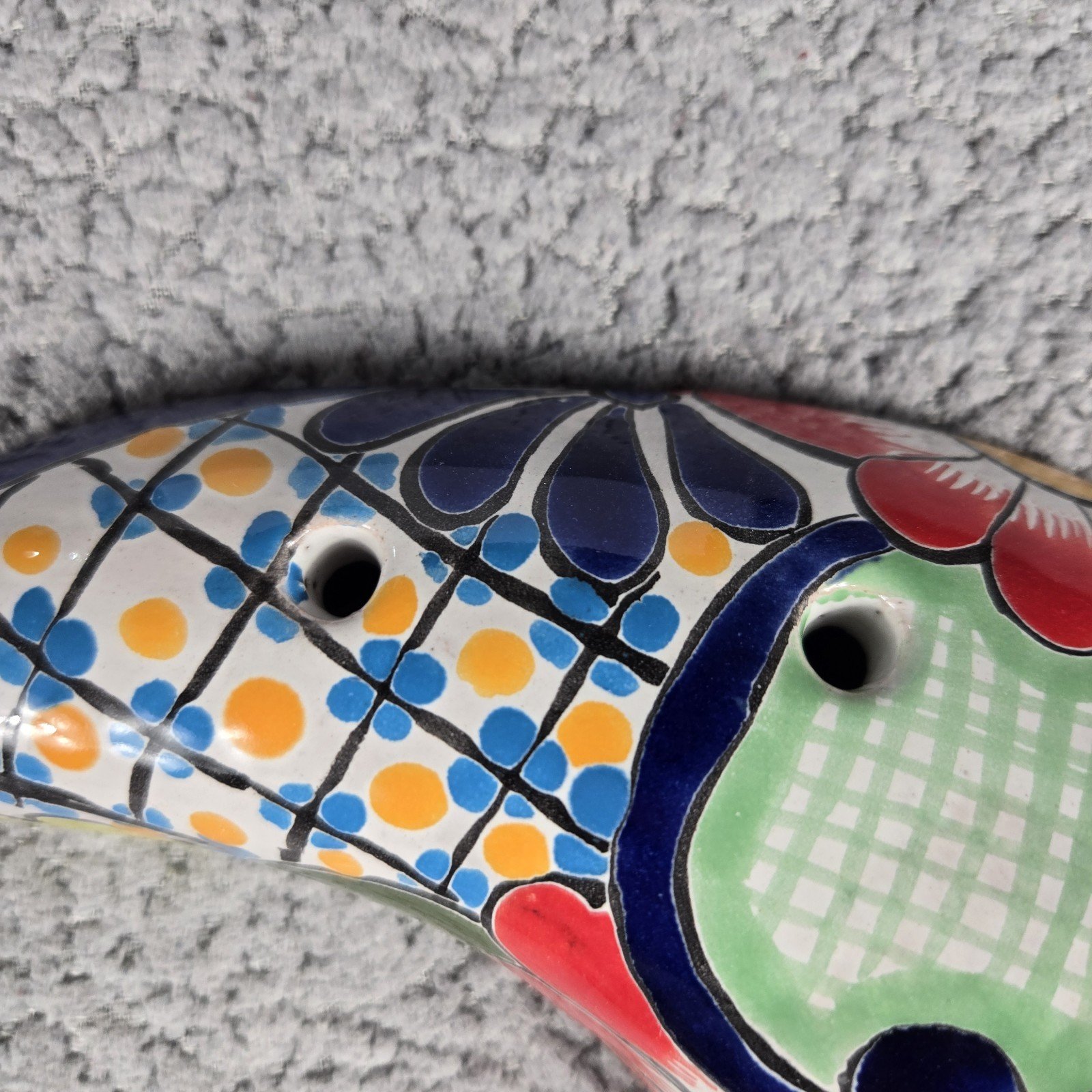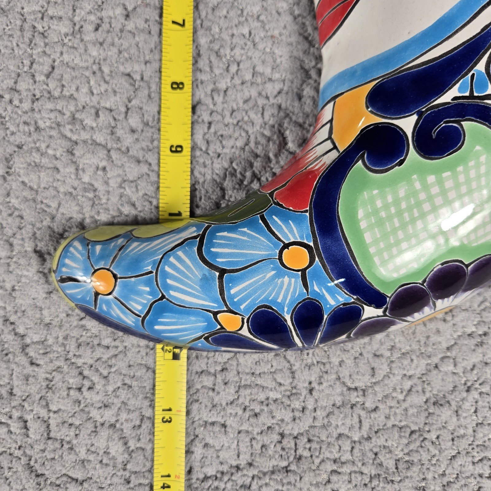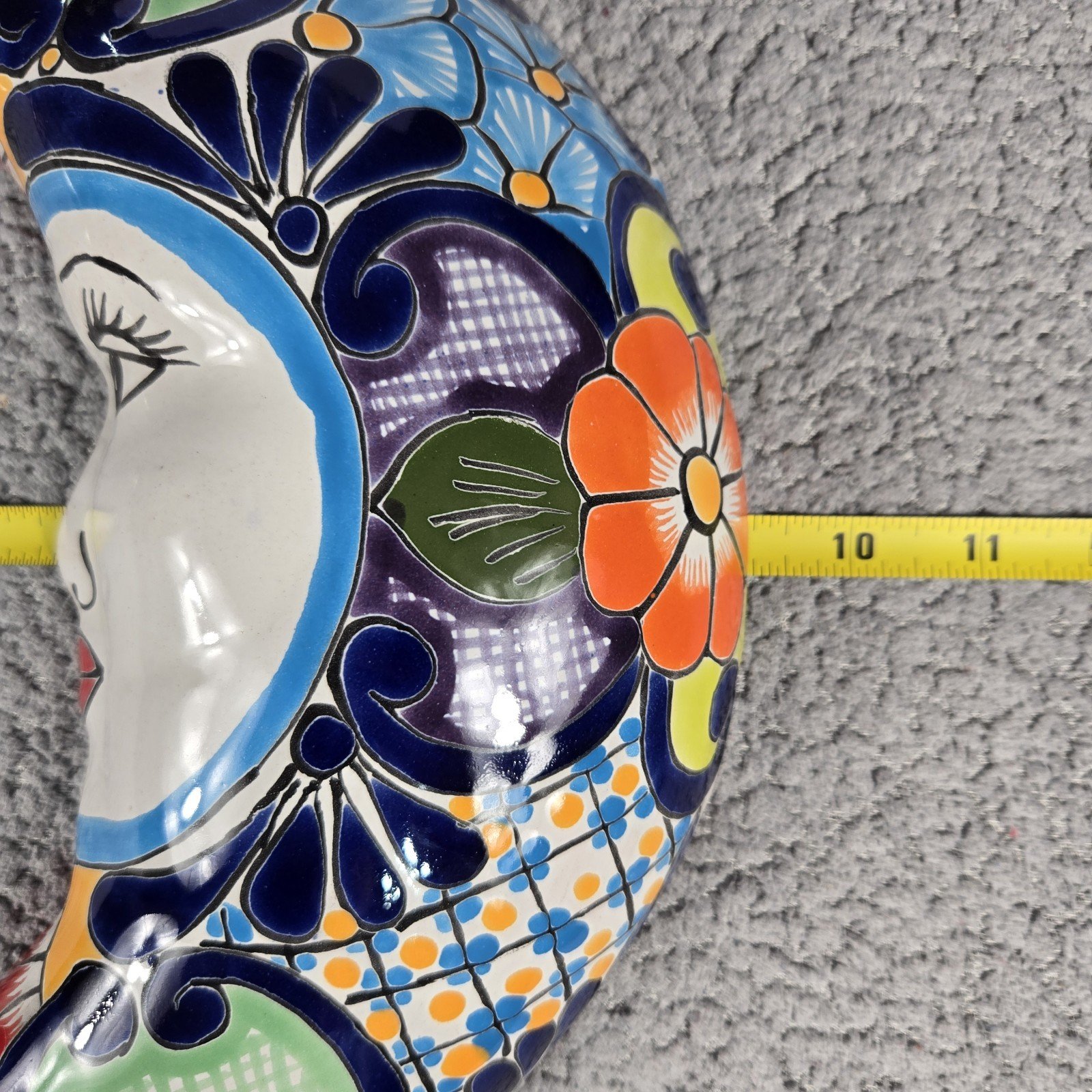 This colorful Talavera Moon Mexican Art Pottery piece is a 12" hand painted wall decor that showcases the traditional Mexican culture through its intricate design. Made in Mexico by the renowned Talavera brand, this piece is a unique collectible that adds a touch of authenticity and artistry to any space. With its vibrant colors and handmade craftsmanship, this Talavera pottery item is sure to be a standout piece in any collection or home decor.