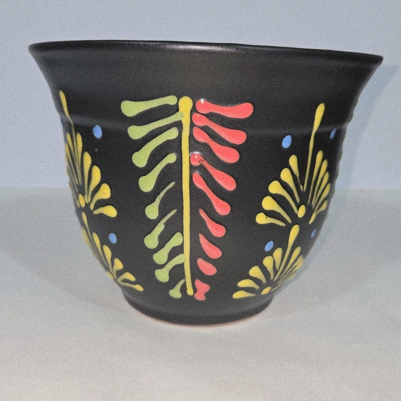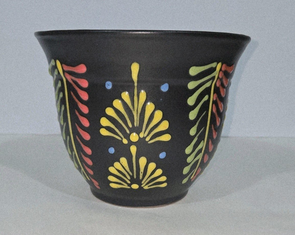 Colors On Black Planter 7 X 5.5 Inches Tall Hand Painted Mexican Art Clay Pot
