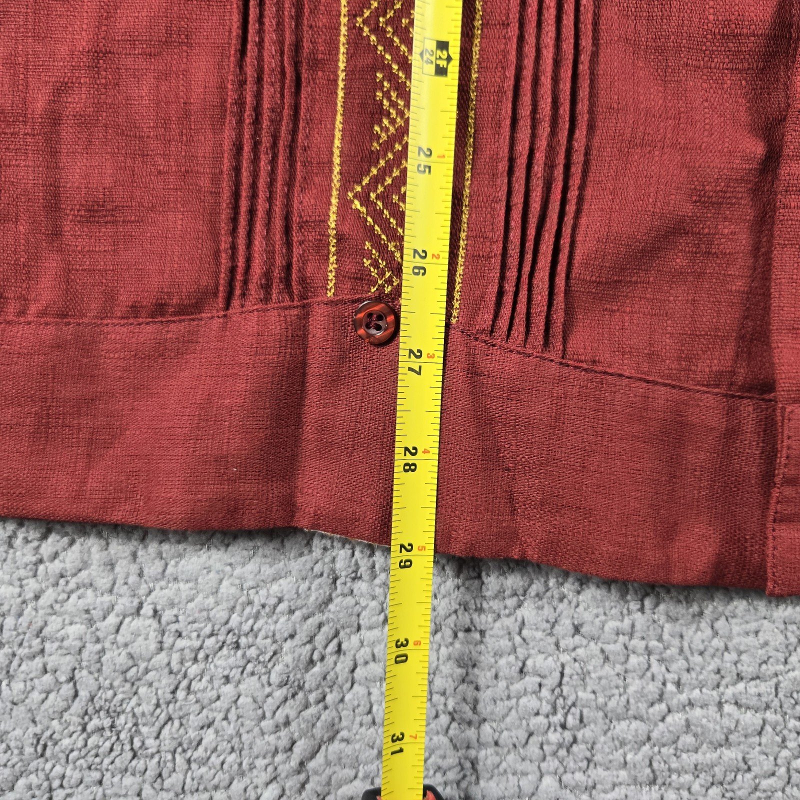 This Guayabera Maroon Long Sleeve shirt is a stylish and comfortable dress shirt made in Mexico. It features a collared neckline, button closure, and is machine washable for easy care. The embroidered accents add a touch of detail to the woven linen fabric, making it perfect for casual occasions with a nature-inspired theme. The regular fit and size 2XL ensure a comfortable and flattering look for men who appreciate quality and traditional Mexican style.