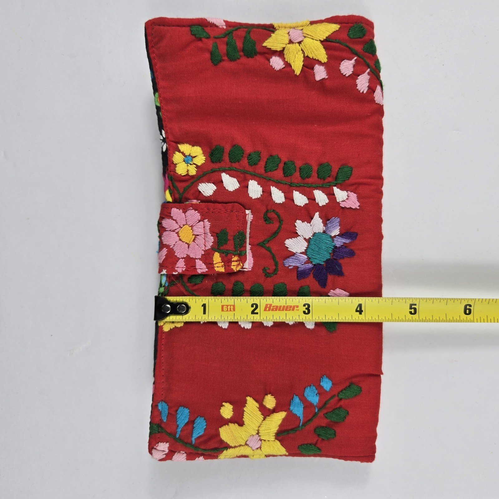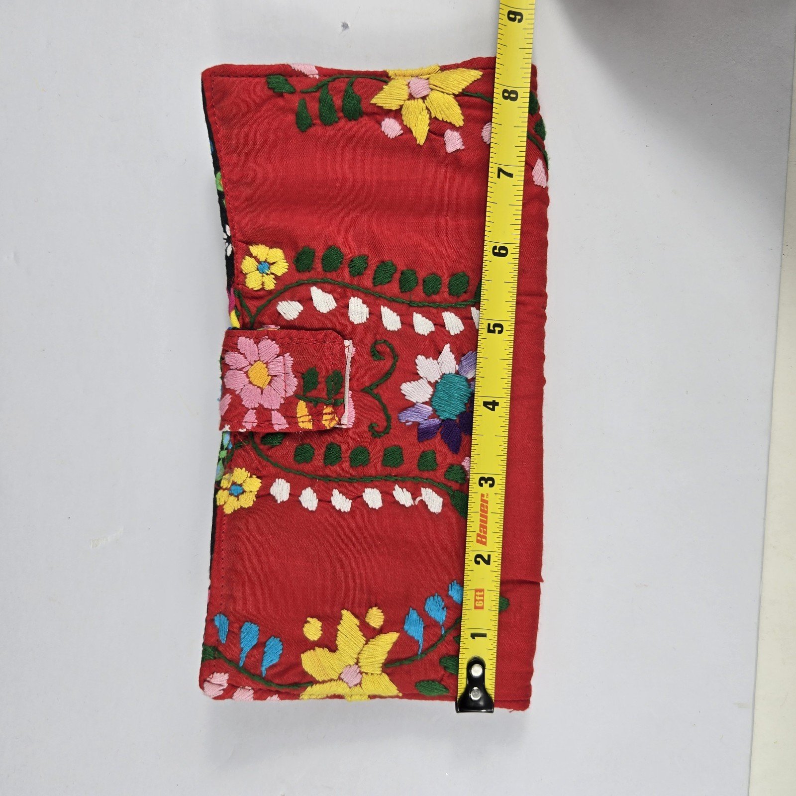 This hand embroidered clutch purse wallet features intricate designs and vibrant colors typical of Mexican craftsmanship. Measuring 4.5 x 8 inches, this accessory is perfect for women looking to add a touch of unique elegance to their outfit. The red color and embroidered accents add a pop of personality to this stylish and functional piece, making it a standout accessory for any occasion. Made in Mexico, this item showcases the rich cultural heritage and skillful craftsmanship of Mexican artisans.
