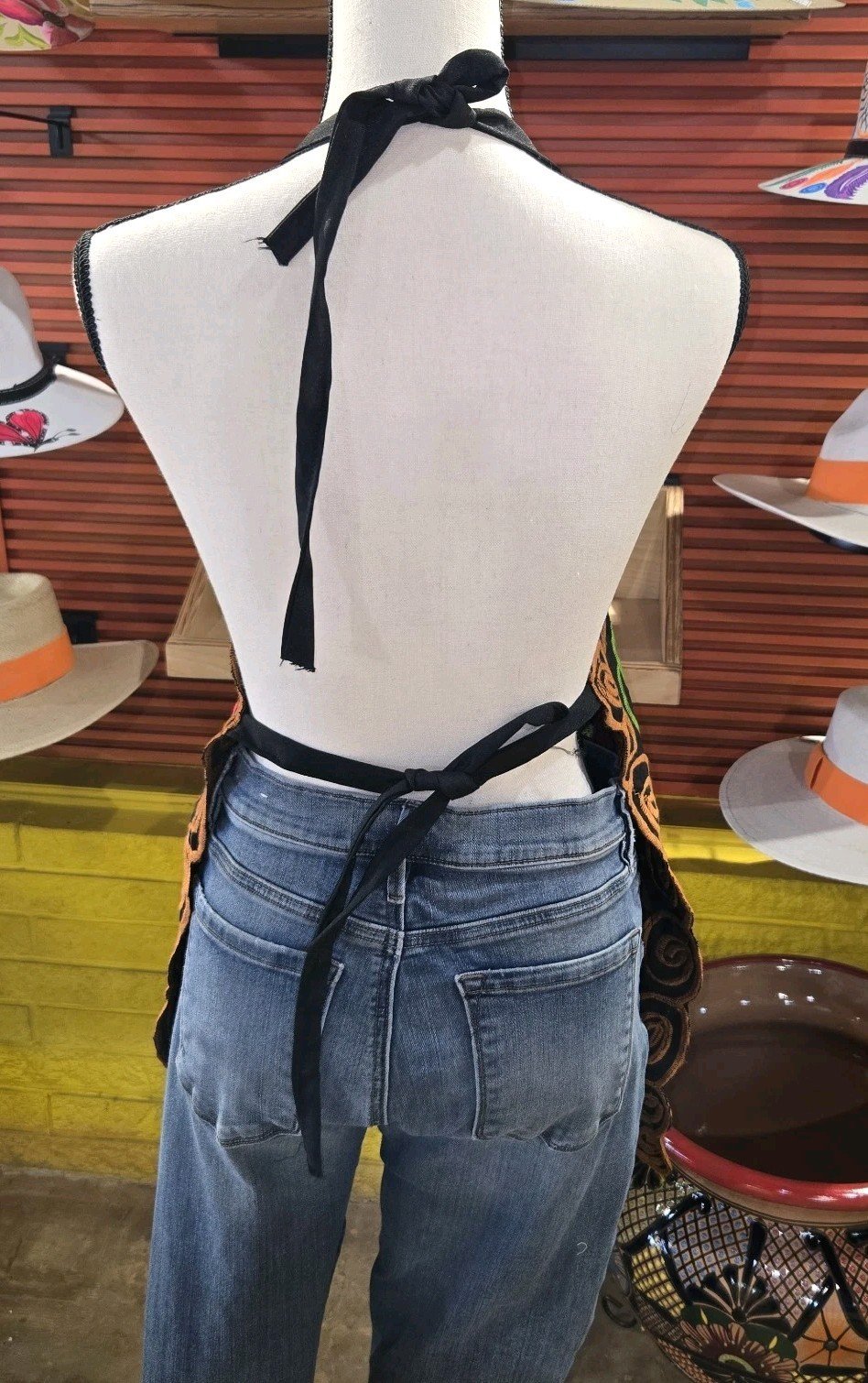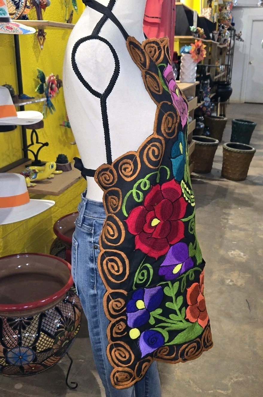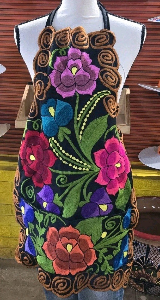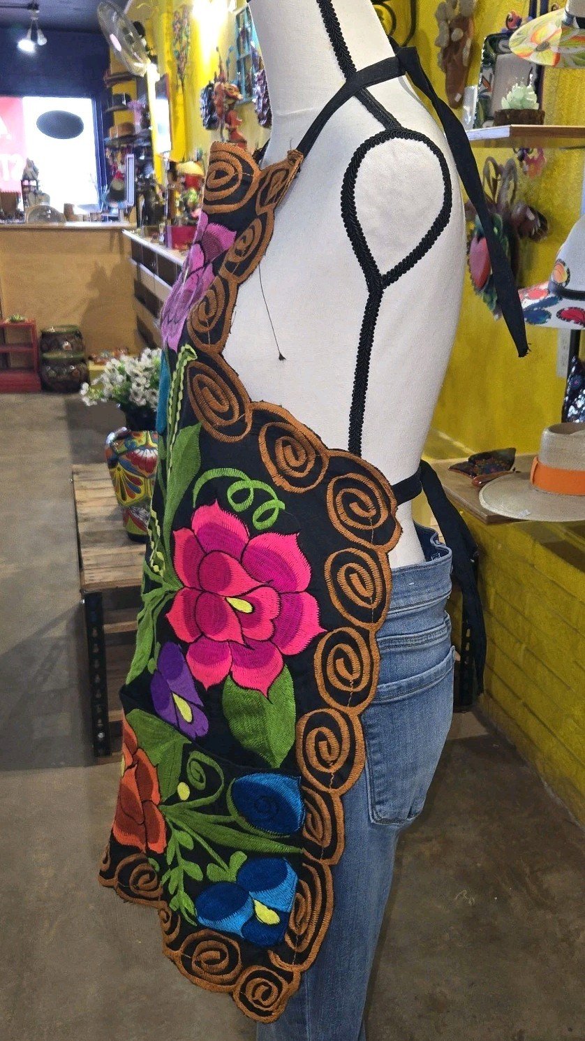 The Mexican Embroidered Flora Apron Mandil Bordado is a handmade kitchen apron featuring a beautiful floral pattern and vibrant multicolor embroidery inspired by traditional Mexican designs. This one-size apron is perfect for women who appreciate unique and colorful accents in their kitchen decor. Made from a durable polyester blend material, this apron is both stylish and practical for everyday cooking or entertaining. Its versatile design makes it suitable for various occasions, adding a touch of Mexican flair to your cooking space.