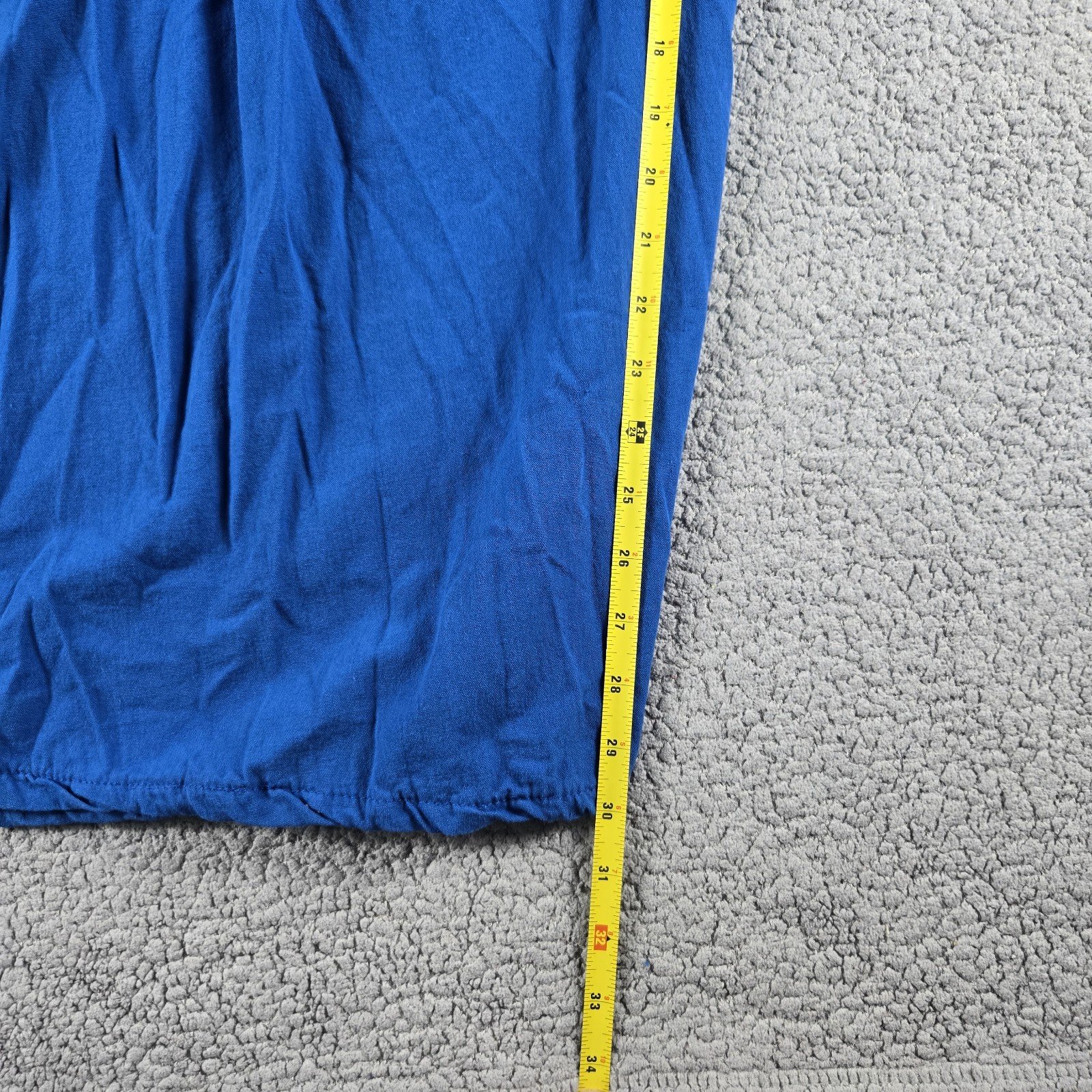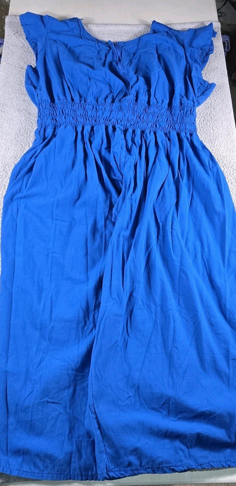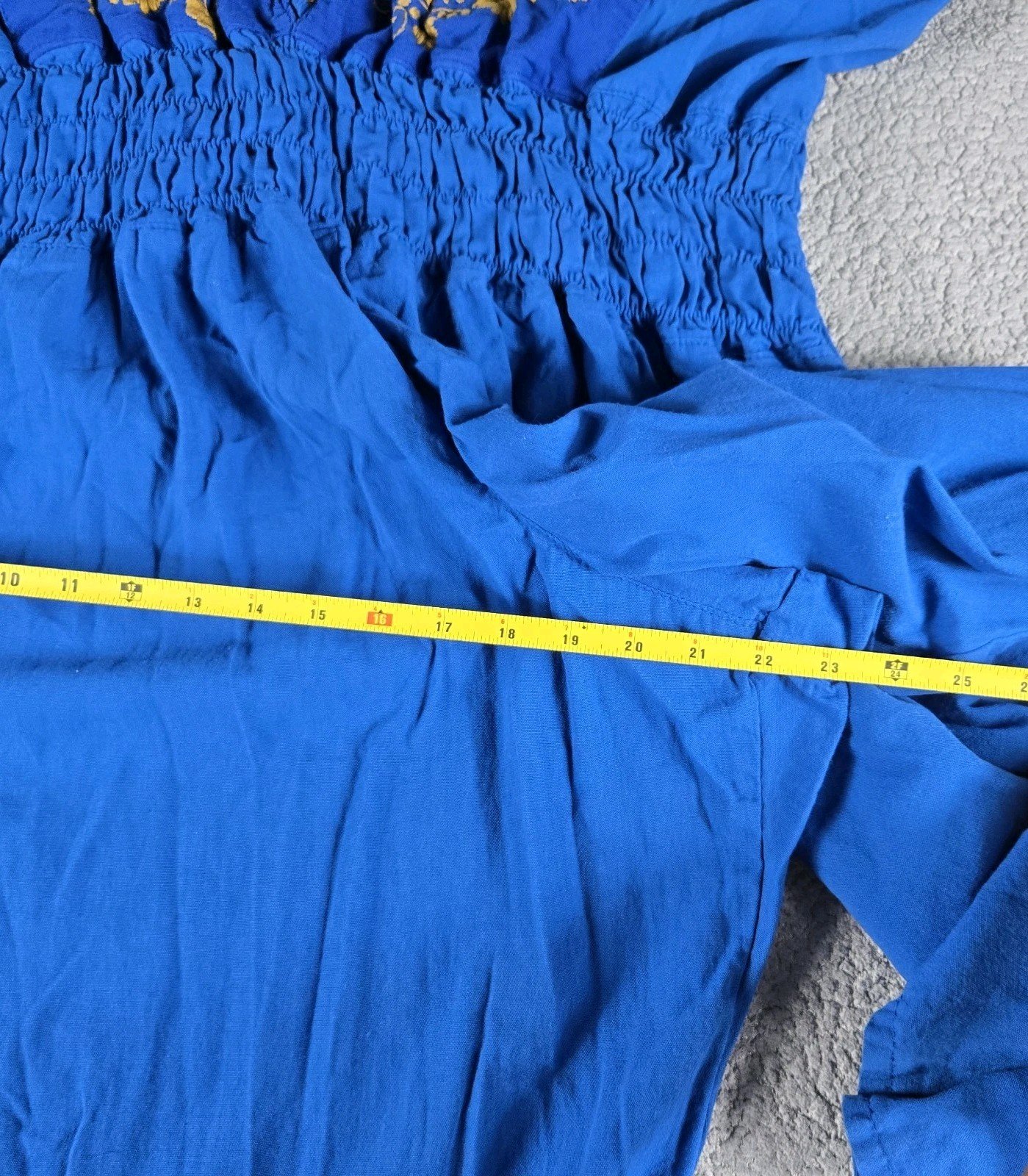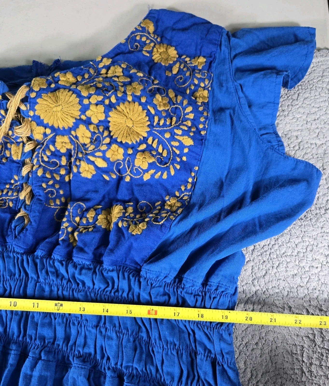 This Mexican embroidered palazzo jumpsuit in 3X size is a handmade one-piece garment perfect for casual occasions. The sleeveless jumpsuit features a beautiful floral pattern in blue color, with intricate embroidered accents for added charm. Made from 100% cotton fabric called manta, it offers a relaxed fit with a straight leg style and a 29-inch inseam. The bohemian theme and comfortable features like a halter tie and smocked detailing make this jumpsuit a stylish and versatile choice for the summer, fall, and spring seasons.