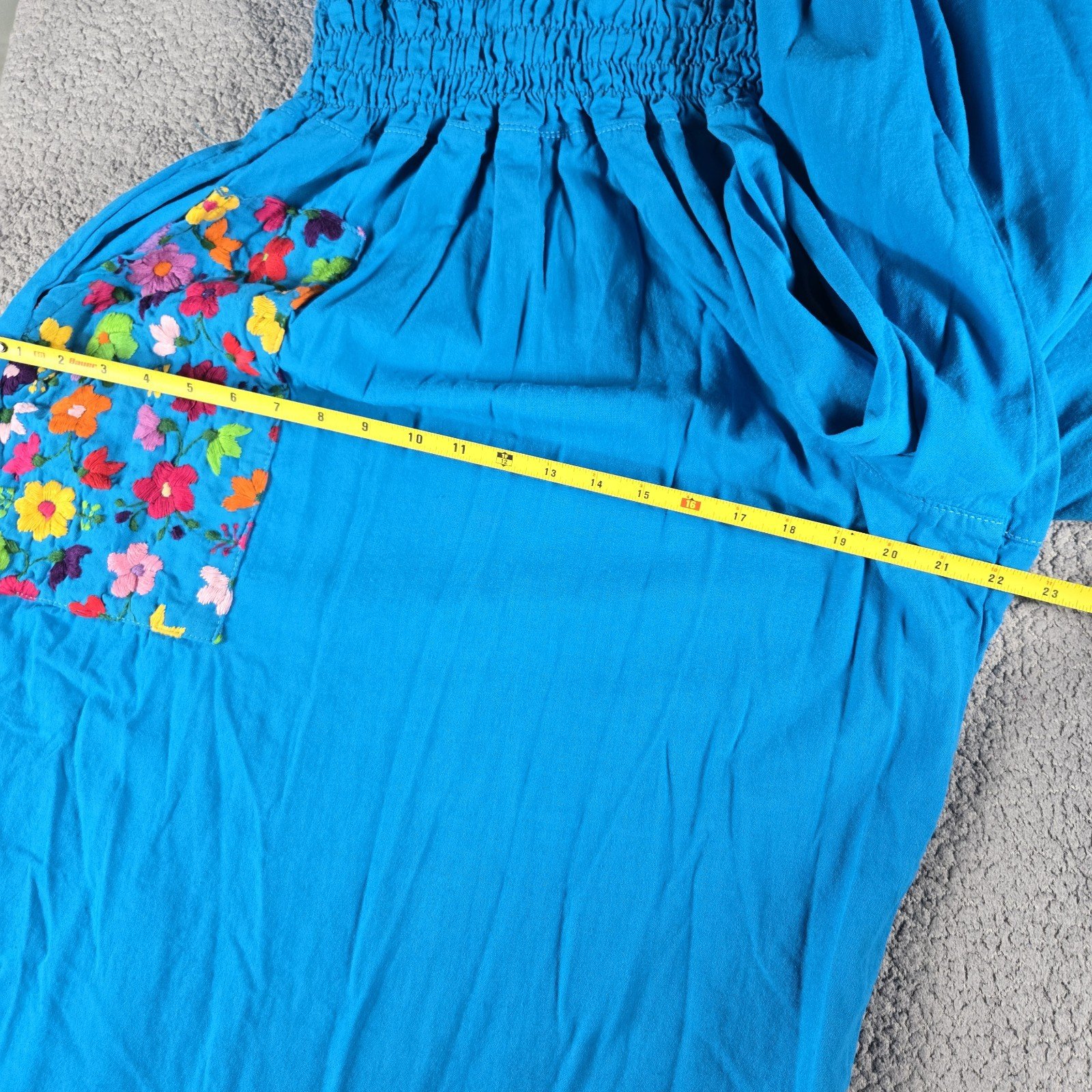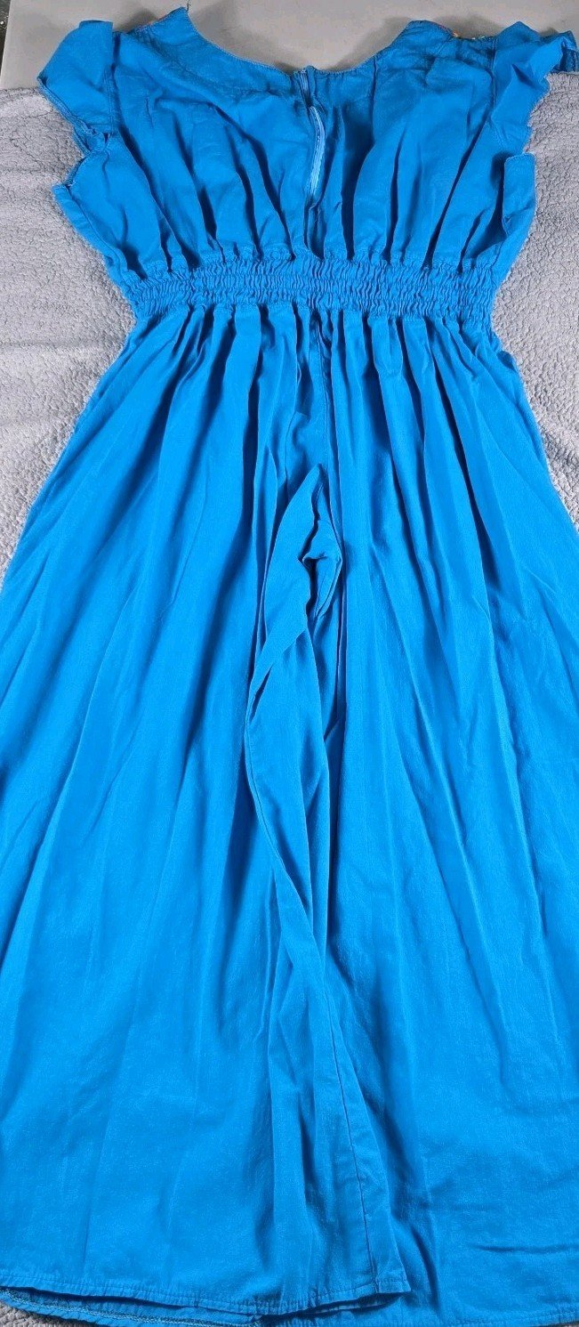 This Mexican Embroidered Palazzo Jumpsuit in size 3X is a handmade one-piece garment perfect for casual occasions. Made from 100% cotton Manta fabric, the light blue jumpsuit features a floral pattern and intricate embroidery accents. With a relaxed fit and straight leg style, this sleeveless jumpsuit includes a pullover closure and a halter tie for added comfort and style. Ideal for the summer, fall, and spring seasons, this bohemian-themed jumpsuit is a unique addition to any woman's wardrobe.