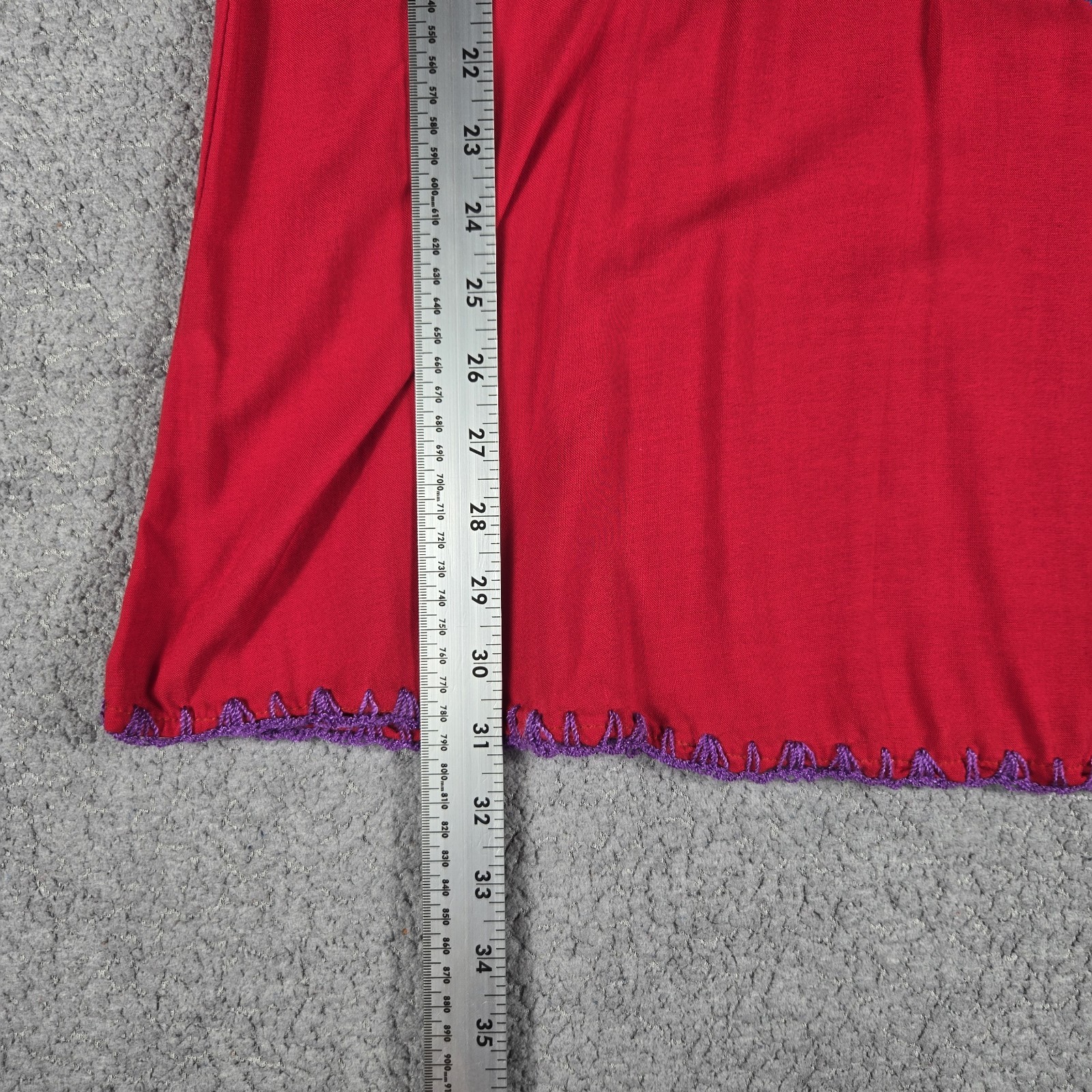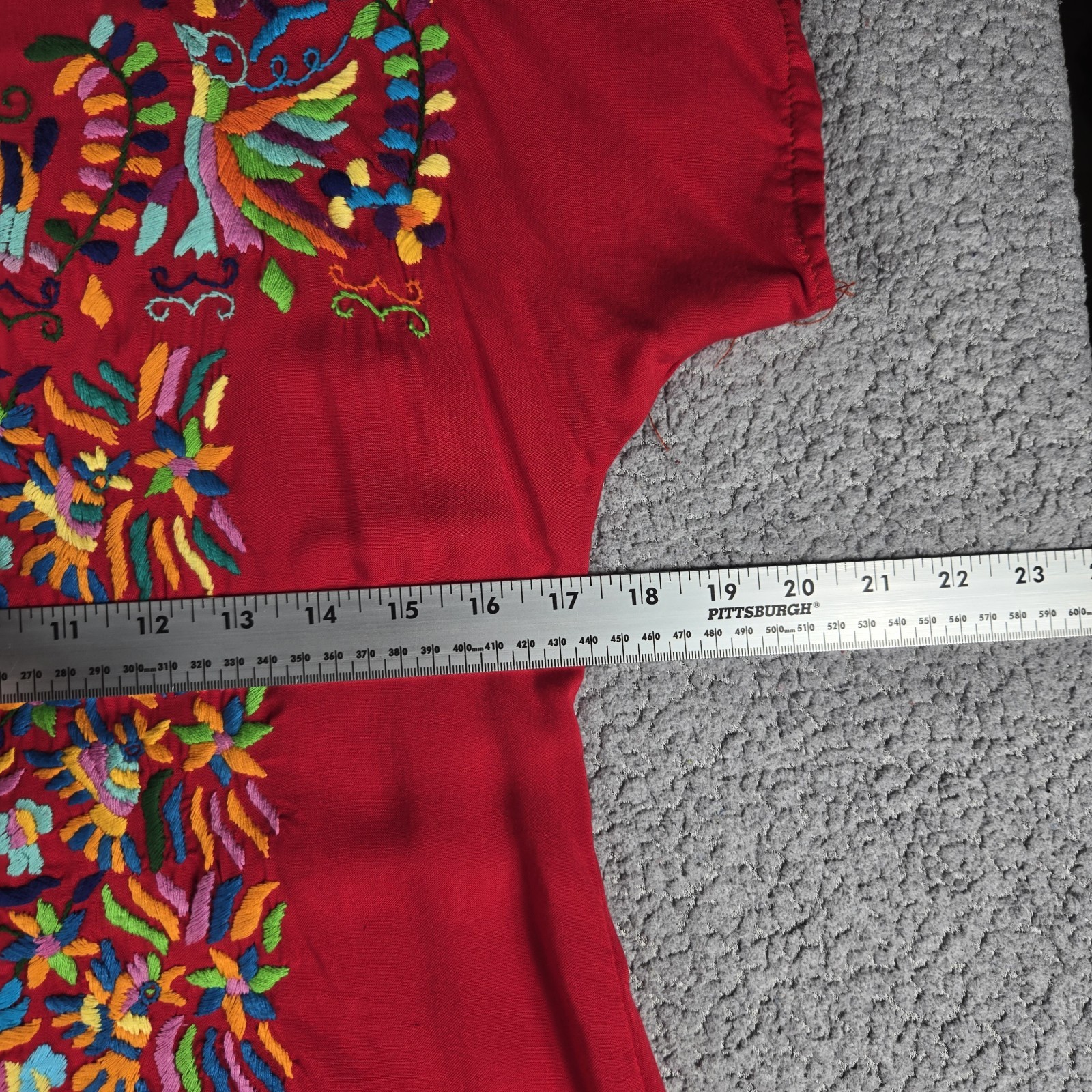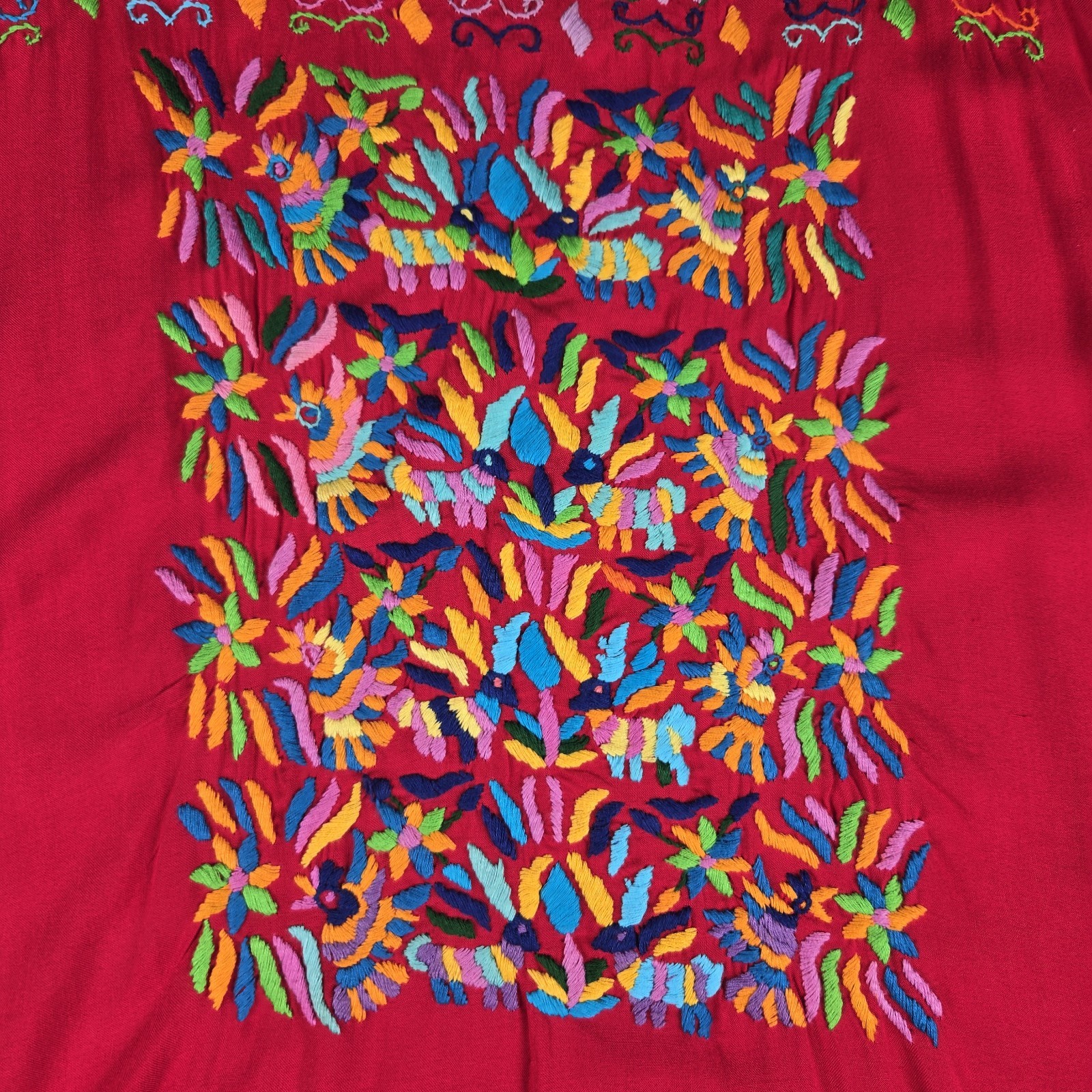 This Mexican embroidered handmade traditional floral dress is a beautiful and unique piece perfect for casual occasions. Made from 100% cotton with intricate embroidered accents, this long dress features a vibrant red color and a nature-inspired theme. The half-sleeve design, pullover closure, and woven fabric make it a comfortable and stylish choice for the summer, fall, or spring seasons. With a medium size and artisanal quality, this dress is a beautiful addition to any woman's wardrobe.