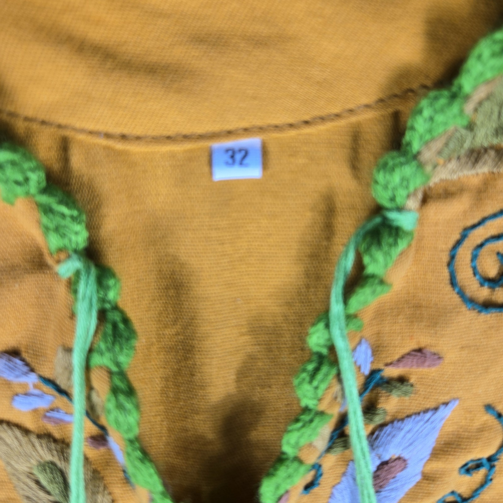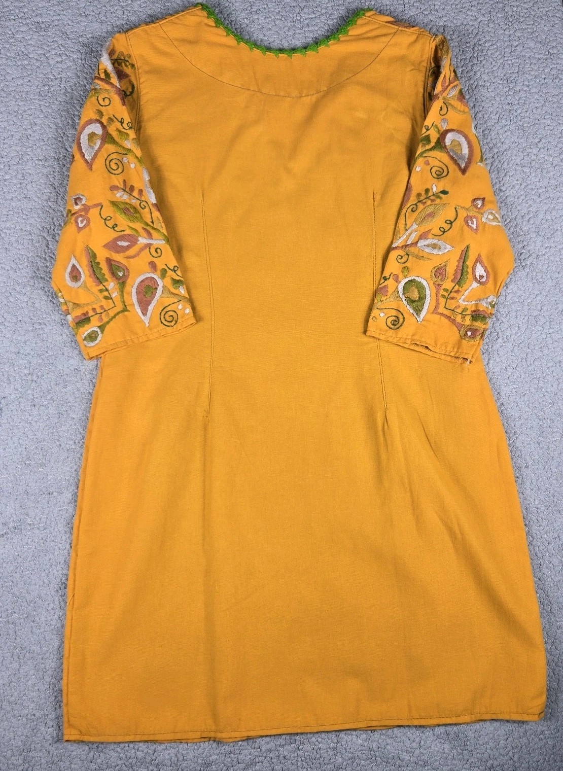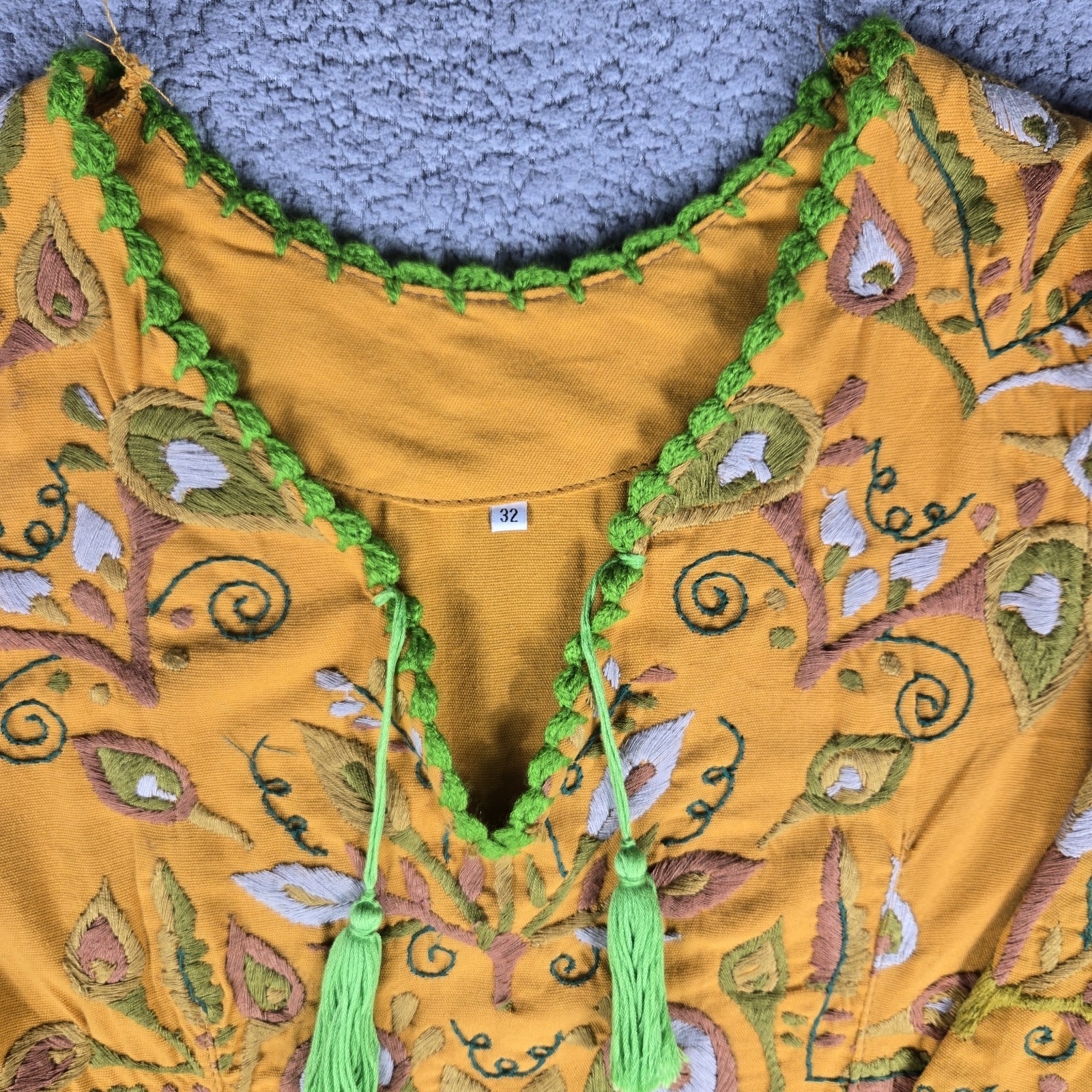 This Mexican handmade traditional floral dress in size 8 medium features a beautiful mustard color with intricate embroidered accents. Made of 100% cotton woven fabric, this long dress has half sleeves and a pullover closure, making it perfect for casual occasions in the summer, fall, or spring. The dress also showcases a nature-inspired bird-themed design, adding a touch of artistry and peasant charm to the overall style. With its authentic Mexican craftsmanship, this dress is a unique and stylish addition to any woman's wardrobe.