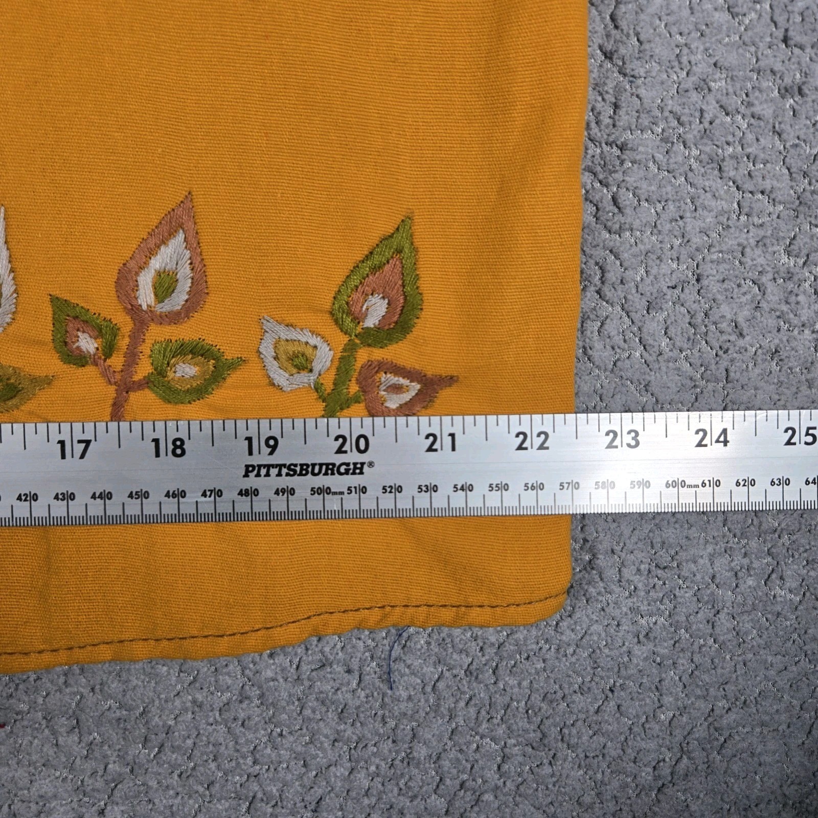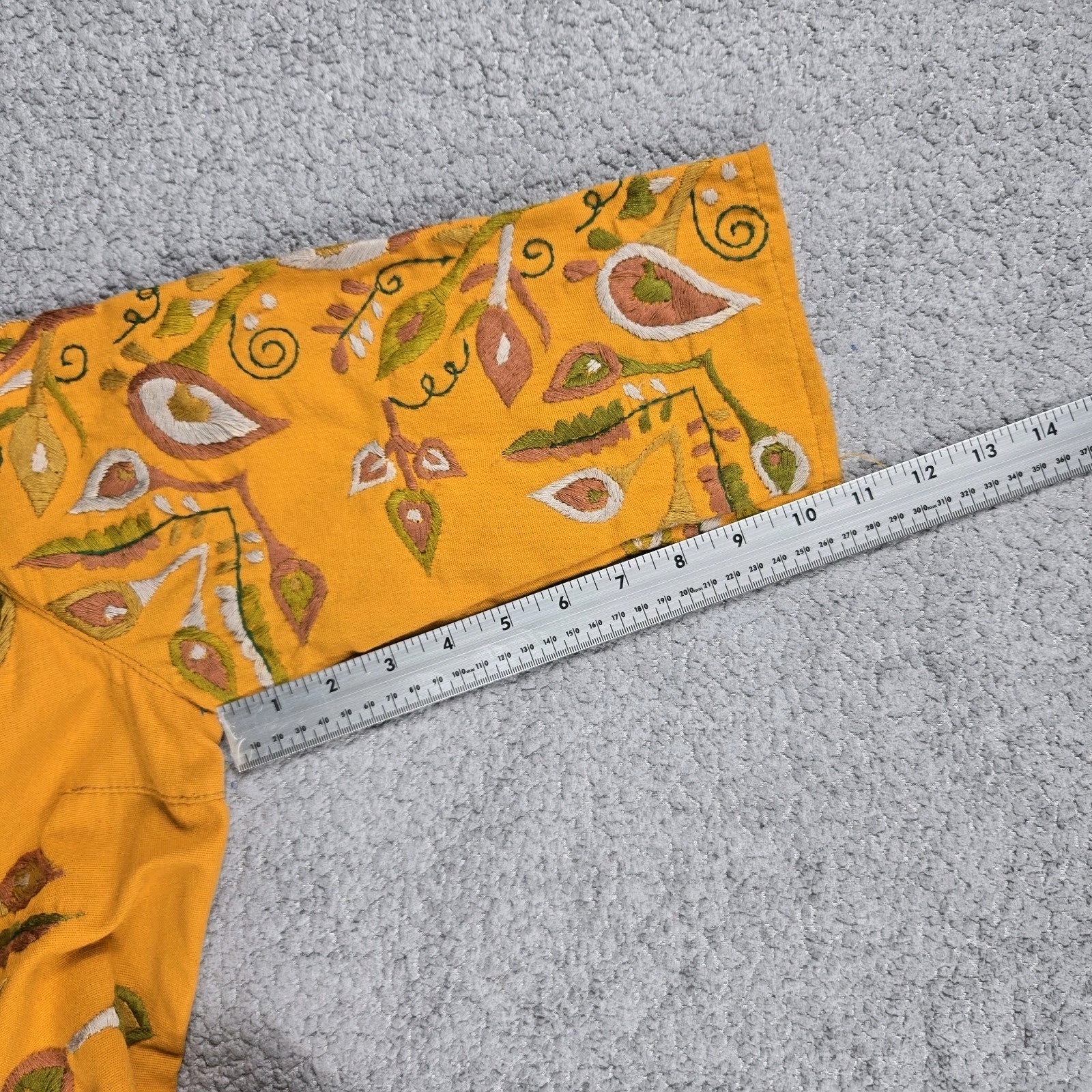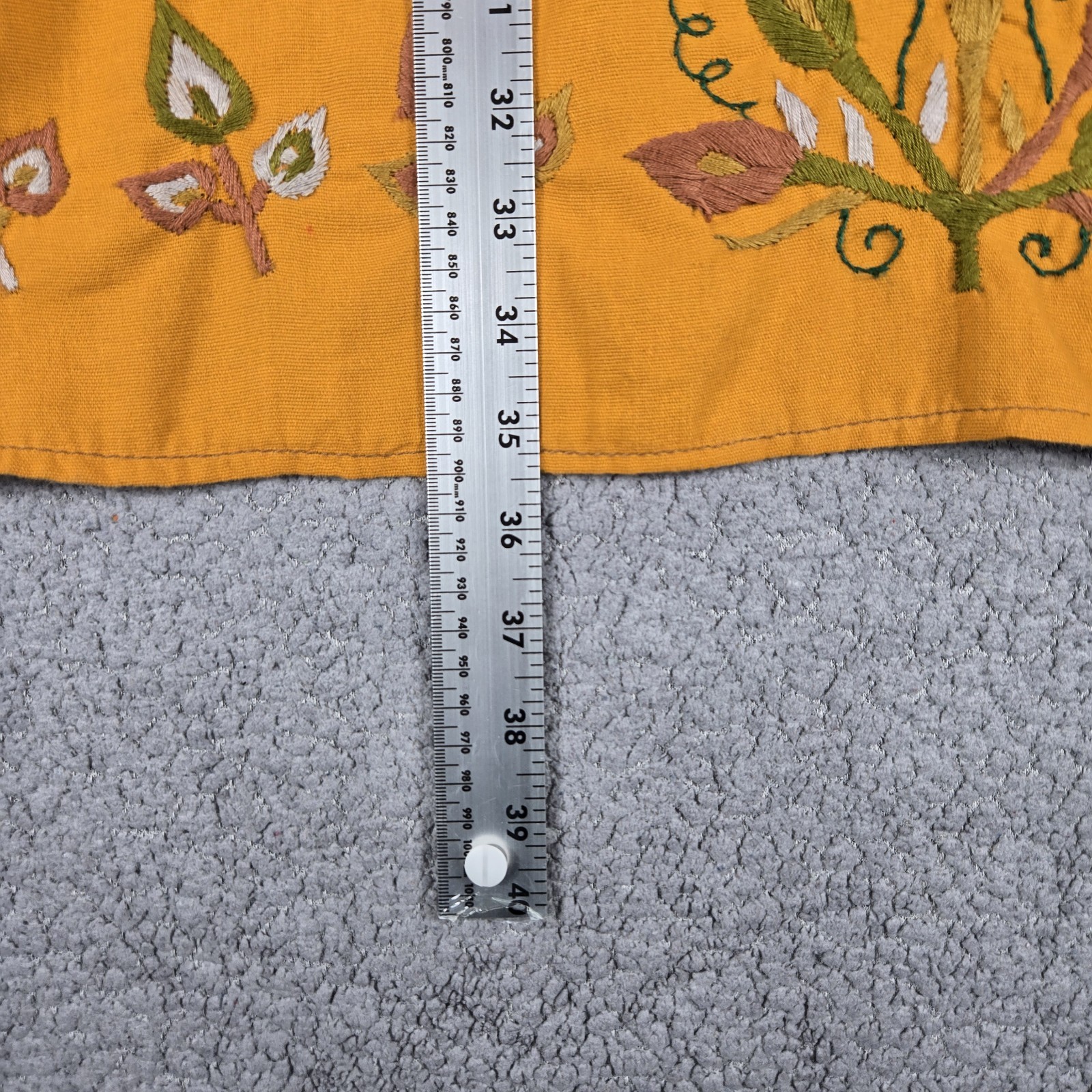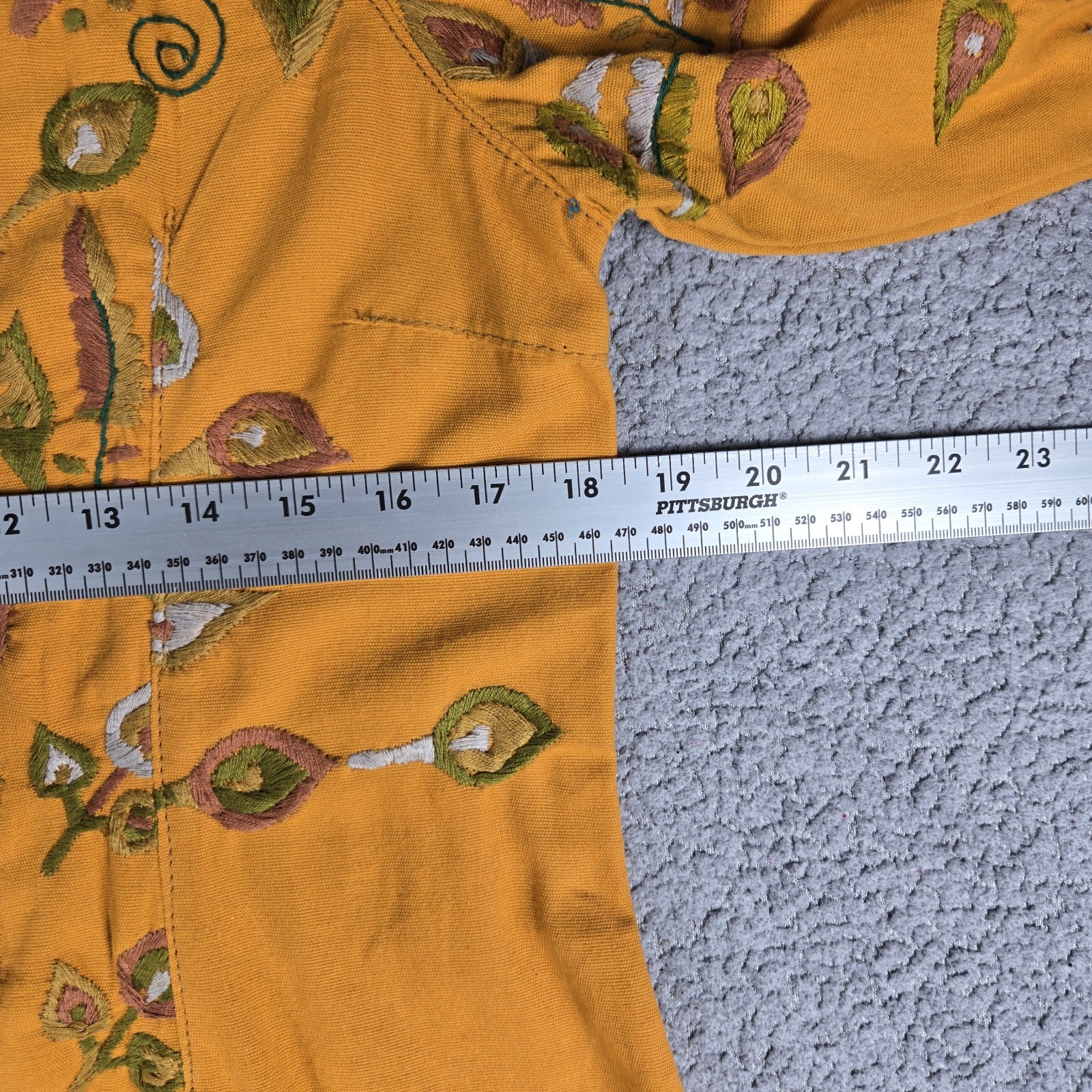 This Mexican handmade traditional floral dress in size 8 medium features a beautiful mustard color with intricate embroidered accents. Made of 100% cotton woven fabric, this long dress has half sleeves and a pullover closure, making it perfect for casual occasions in the summer, fall, or spring. The dress also showcases a nature-inspired bird-themed design, adding a touch of artistry and peasant charm to the overall style. With its authentic Mexican craftsmanship, this dress is a unique and stylish addition to any woman's wardrobe.