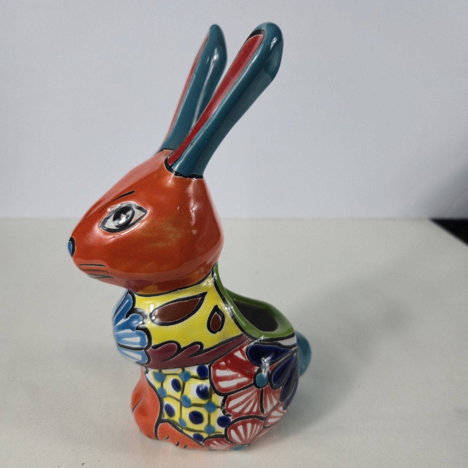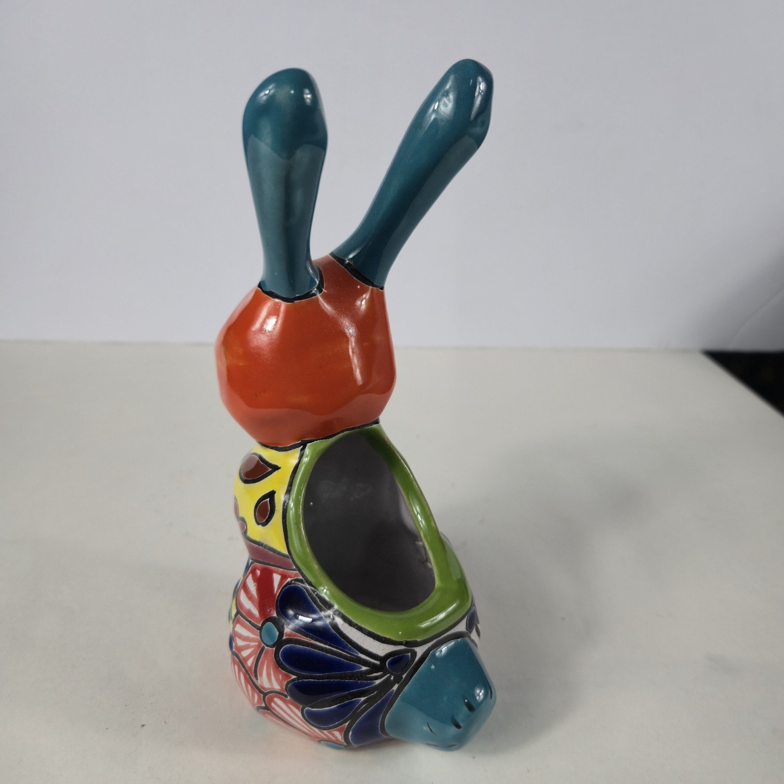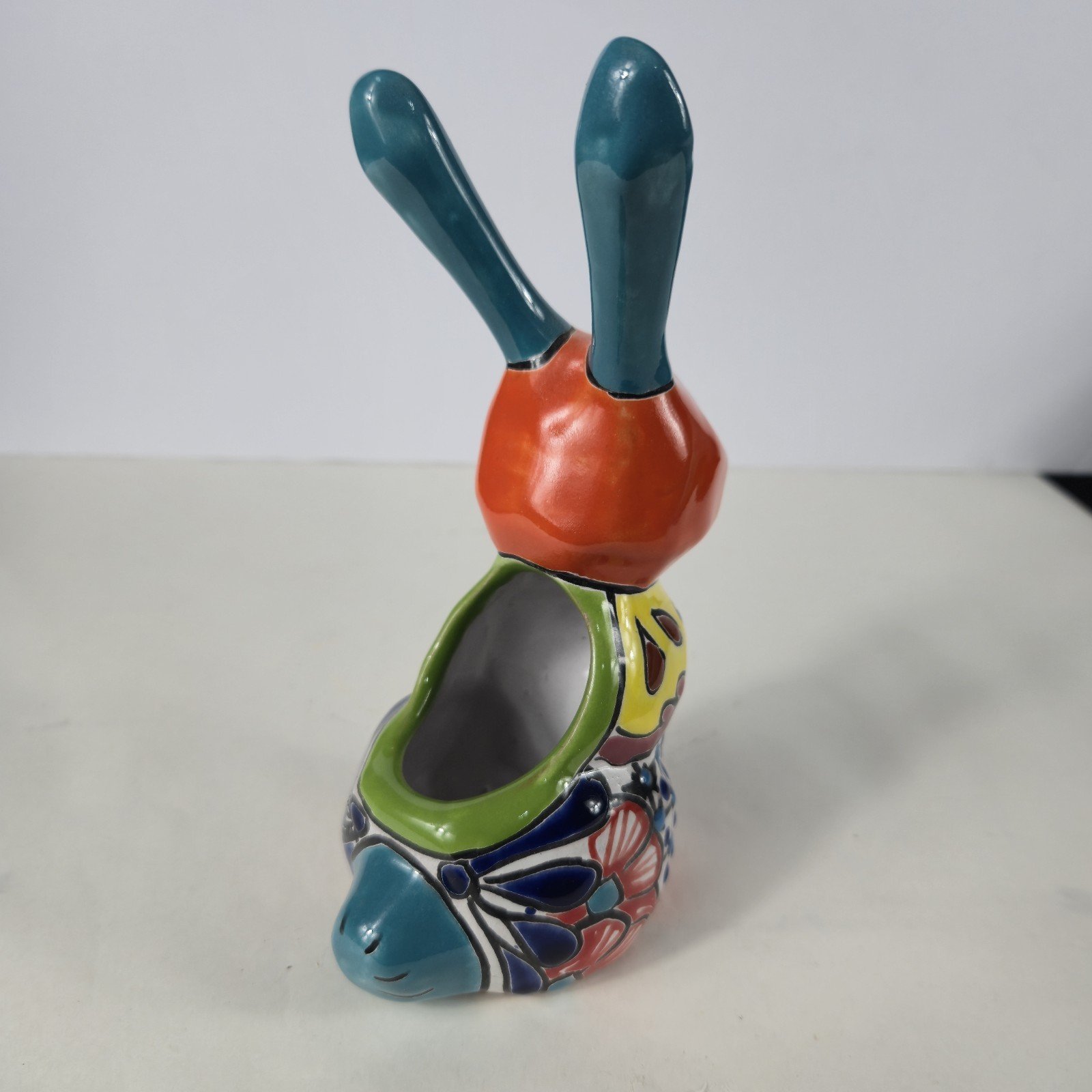 The Talavera Bunny Planter is a beautifully hand-painted Mexican art piece perfect for displaying succulants. The intricate design and vibrant colors reflect the traditional Mexican culture, making it a unique and charming addition to any collection. Made in Mexico, this unbranded piece showcases the talent and craftsmanship of Mexican artisans, adding a touch of authenticity and artistry to any space.