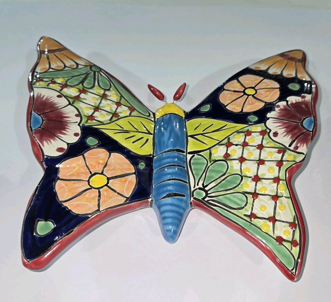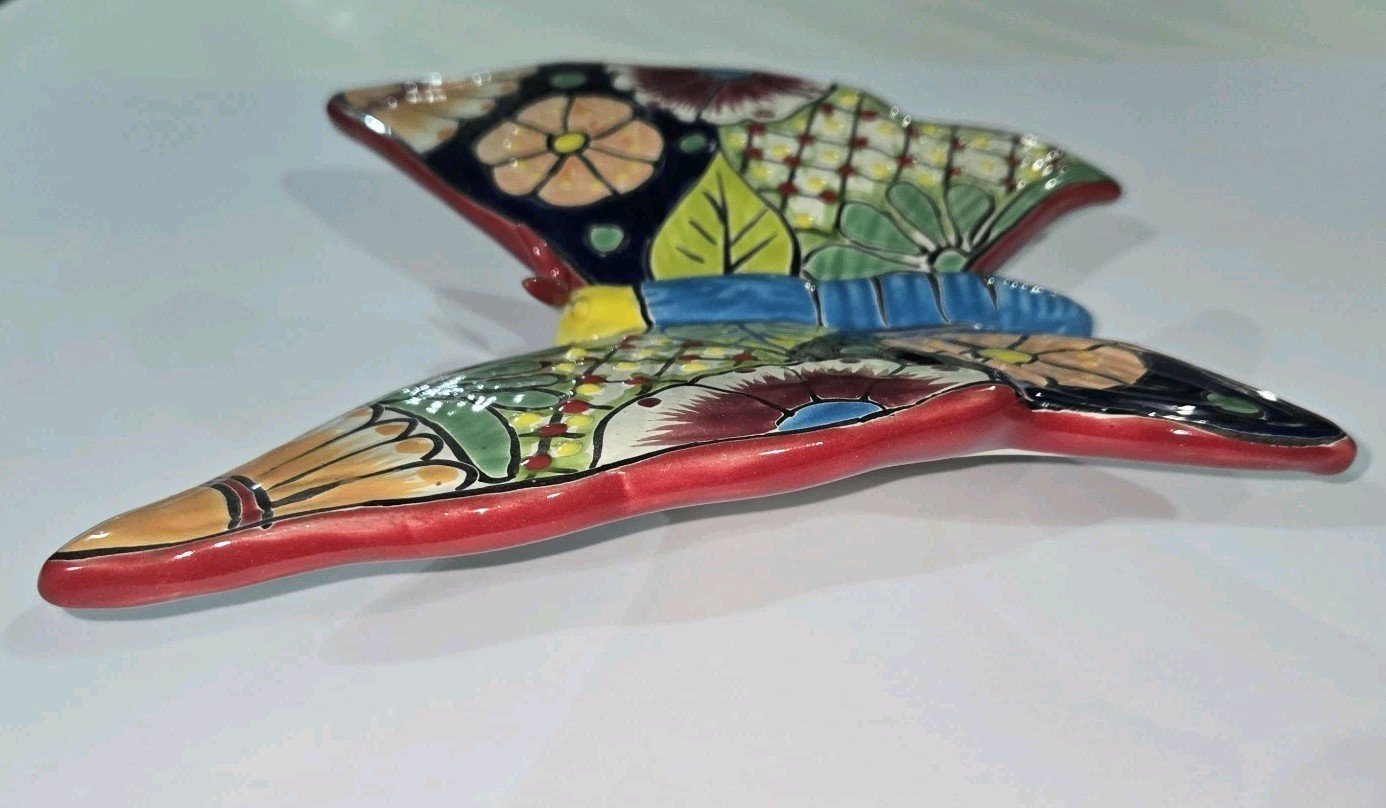 The Talavera Butterfly Mexican Handcrafted Art Wall Hanging is a handmade piece that showcases traditional Mexican culture. This art wall hanging, measuring 9.5 x 8.5 inches tall, is crafted in Mexico with a unique Talavera brand, reflecting the rich heritage and craftsmanship of Mexican pottery. Perfect for collectors of Latin American art or those looking to add a touch of Mexican culture to their home decor, this piece is a beautiful and authentic representation of Mexican artistry.