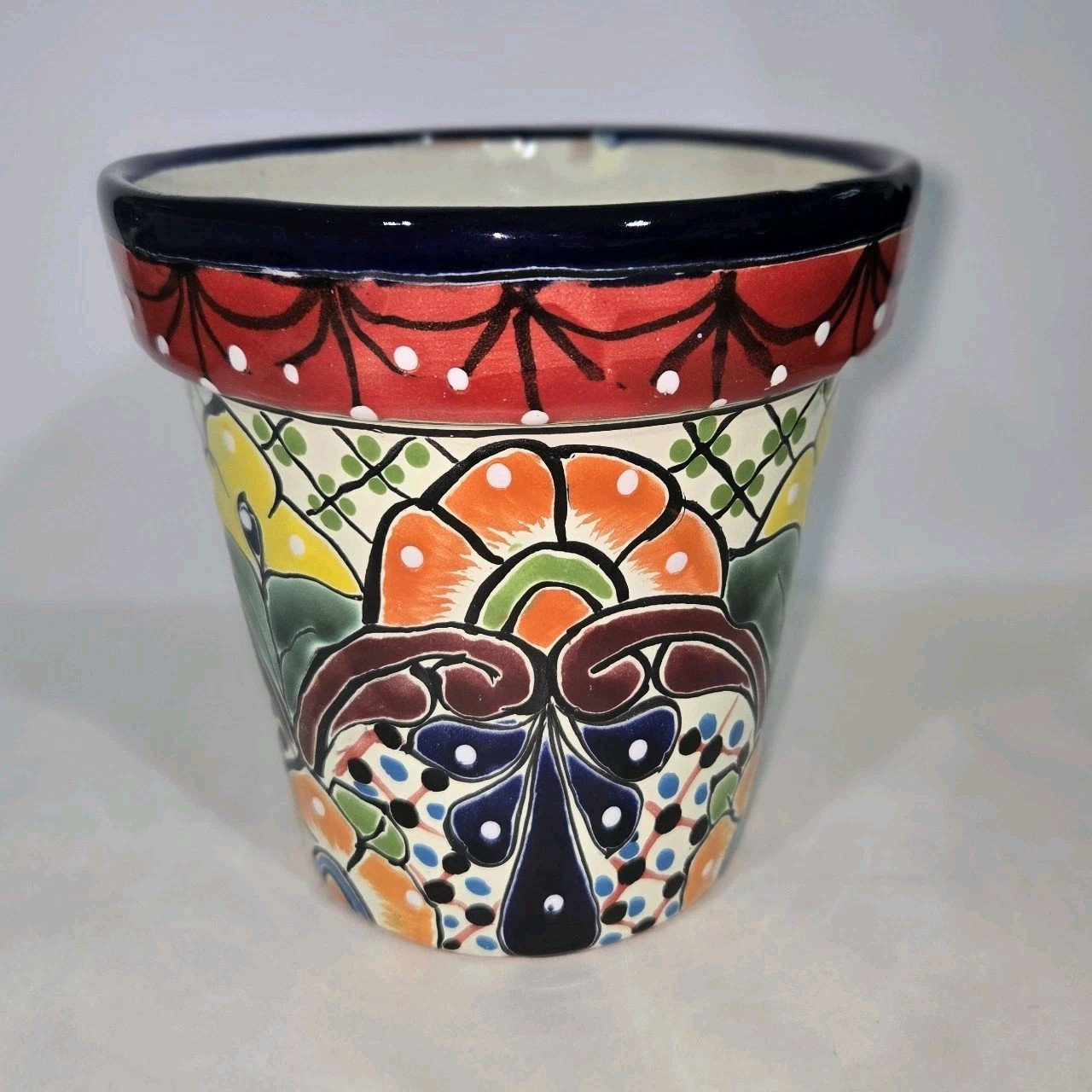 The Talavera Clay Planter is a hand-painted Mexican art piece measuring 6.5 x 6.5 inches. Made in Mexico, this unique planter showcases vibrant colors and intricate designs typical of Mexican culture. Perfect for collectors or those looking to add a touch of Latin American flair to their home decor, this unbranded product is sure to make a statement with its beautiful craftsmanship and traditional Mexican aesthetic.