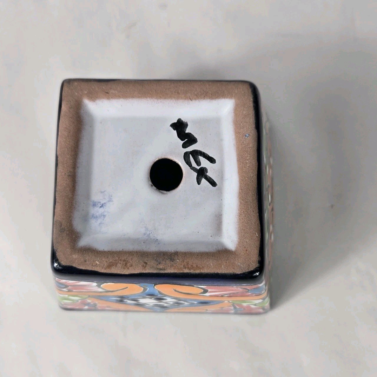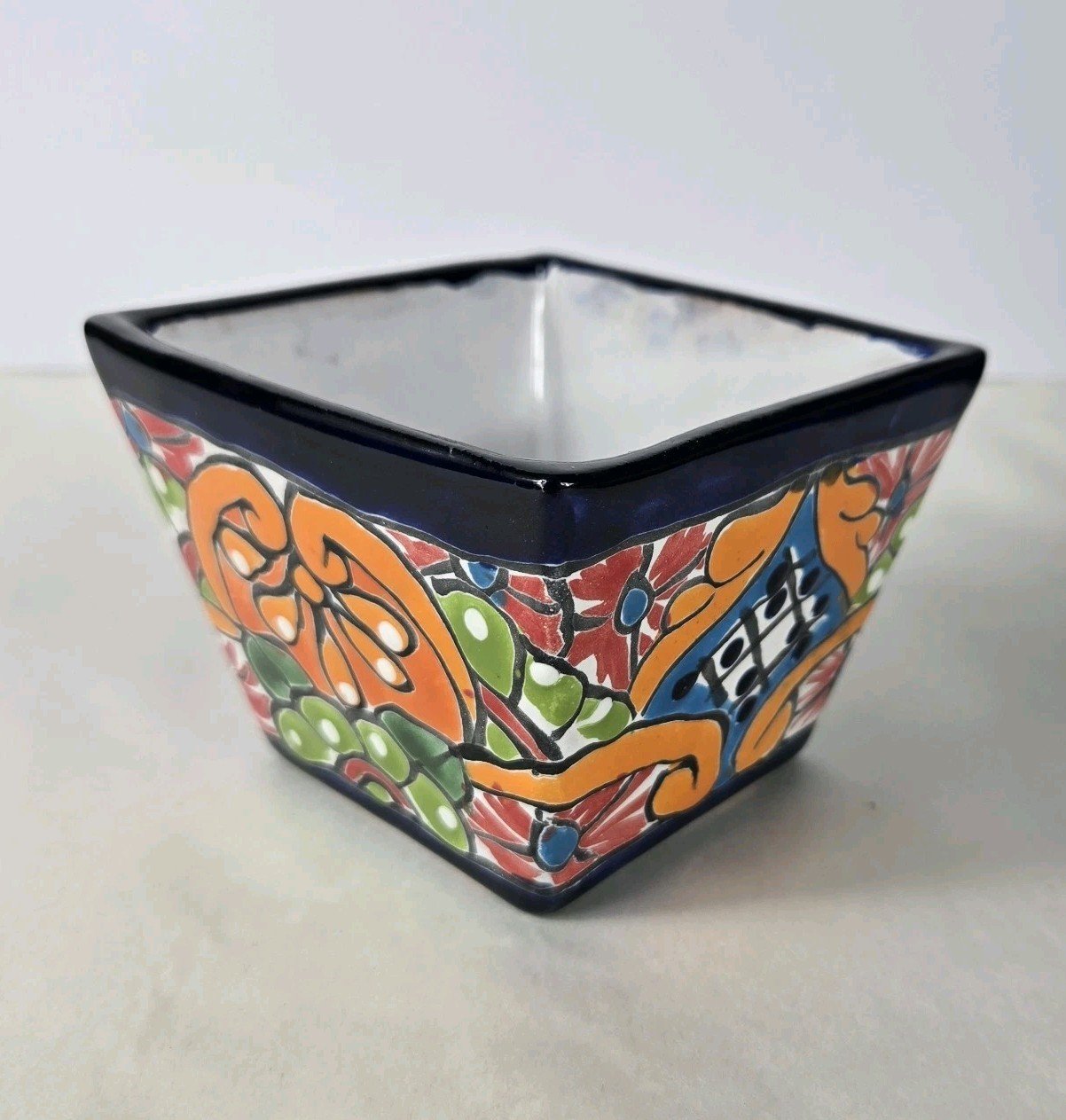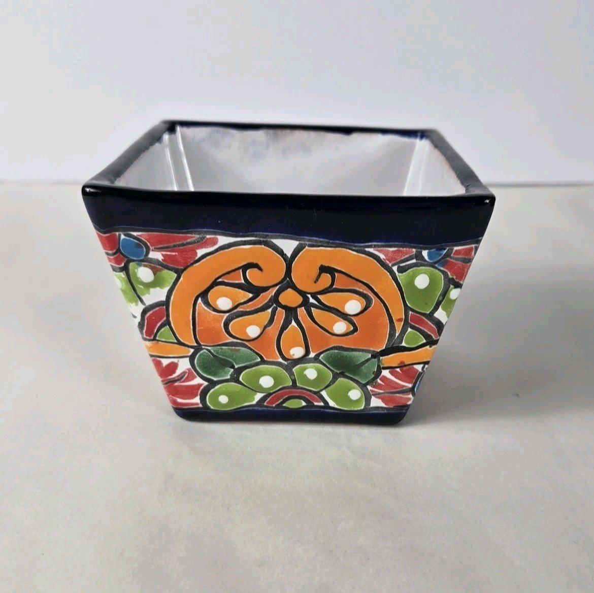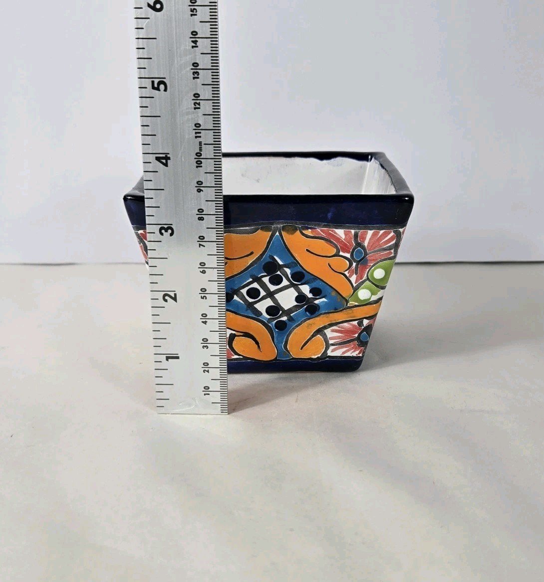 This colorful square planter mini pot combines Mexican art with a unique square shape, standing at 3 inches tall and 4.5 inches wide. Made of ceramic with a glossy finish, this indoor and outdoor piece features vibrant multicolor patterns typical of art pottery production. Imported from Mexico, this planter adds a touch of artistic flair to any space, making it a decorative and functional addition to your home or garden.