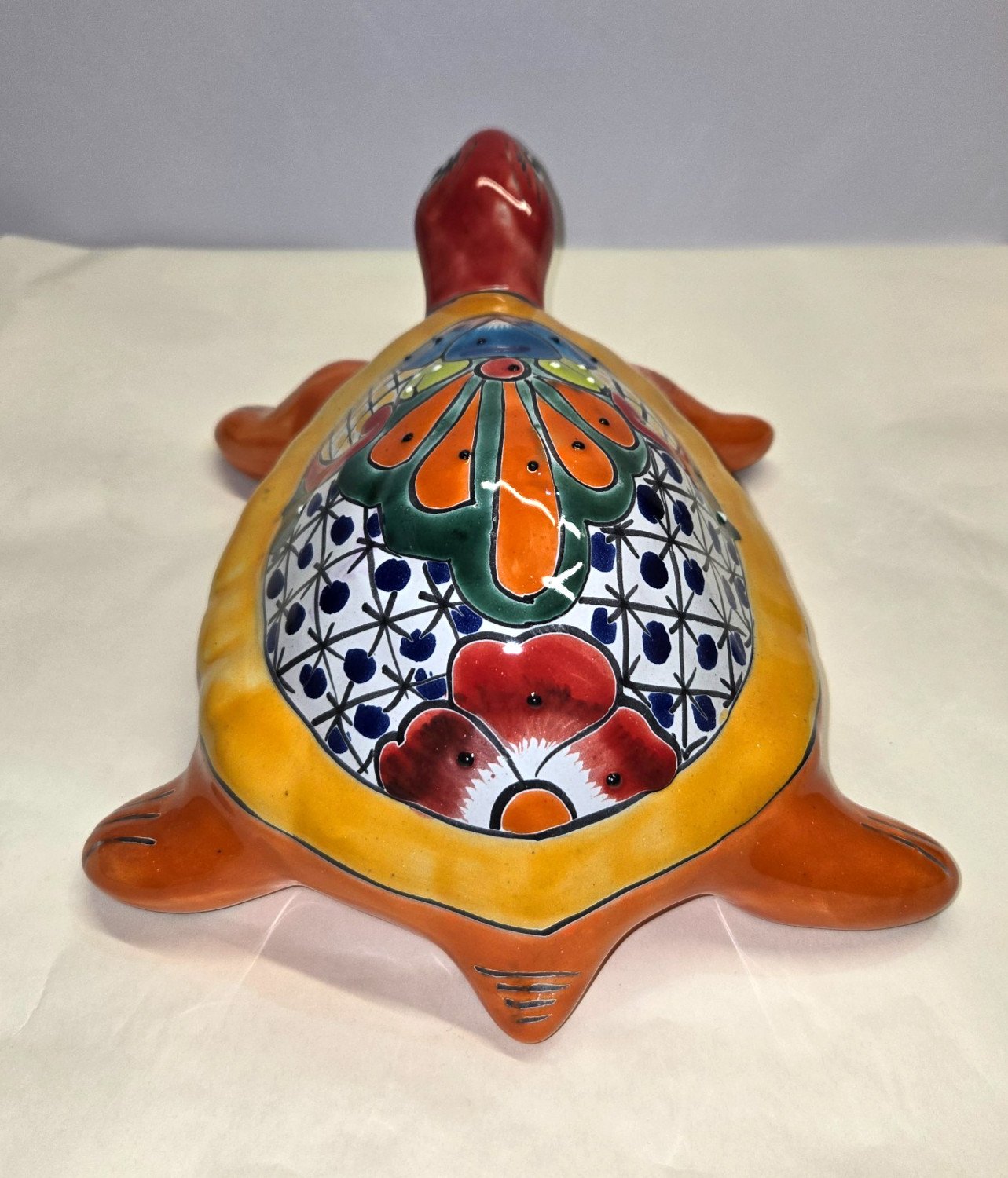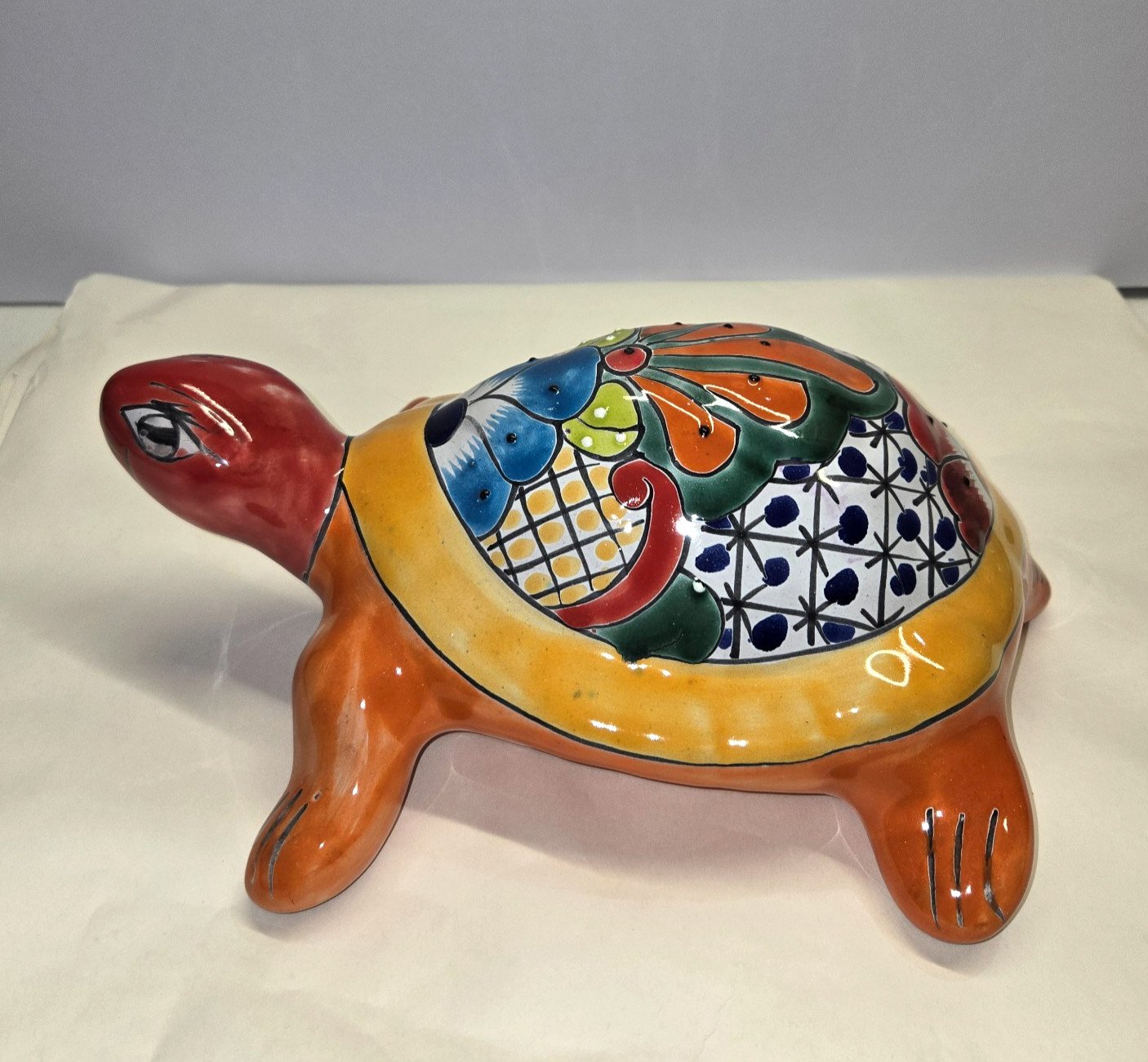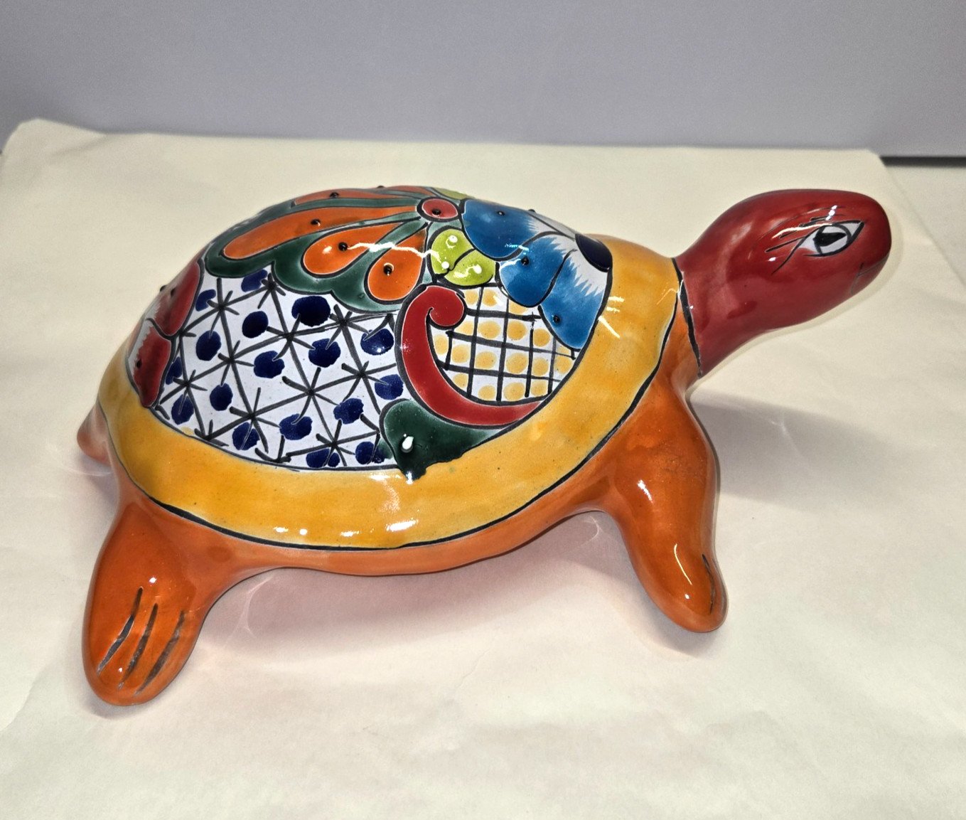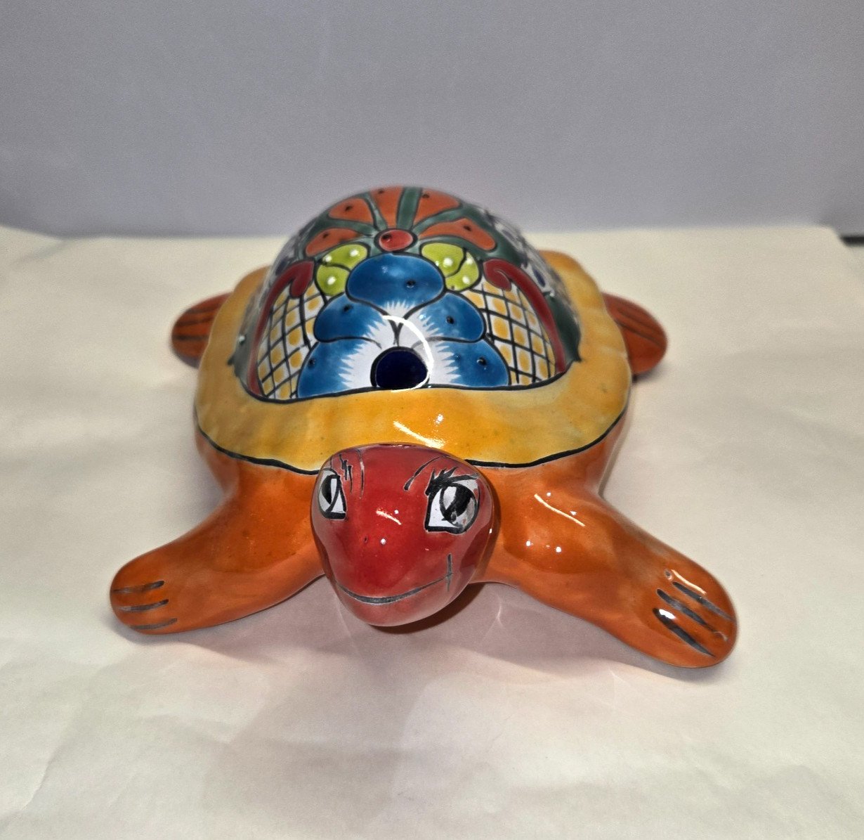 This Talavera handmade turtle pottery piece is a beautiful example of Mexican art, measuring 9x12x4.5 inches. The rich colors and intricate designs typical of Talavera pottery are showcased in this unique and cultural collectible. Made in Mexico, this piece reflects the craftsmanship and heritage of Mexican artisans, making it a special addition to any pottery collection or a perfect gift for someone who appreciates Latin American cultures and ethnicities.