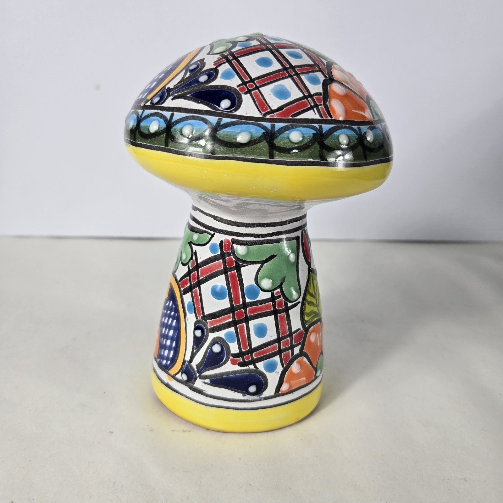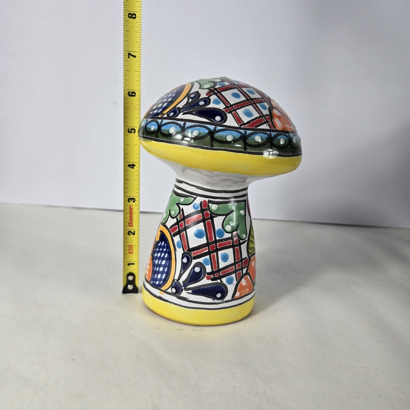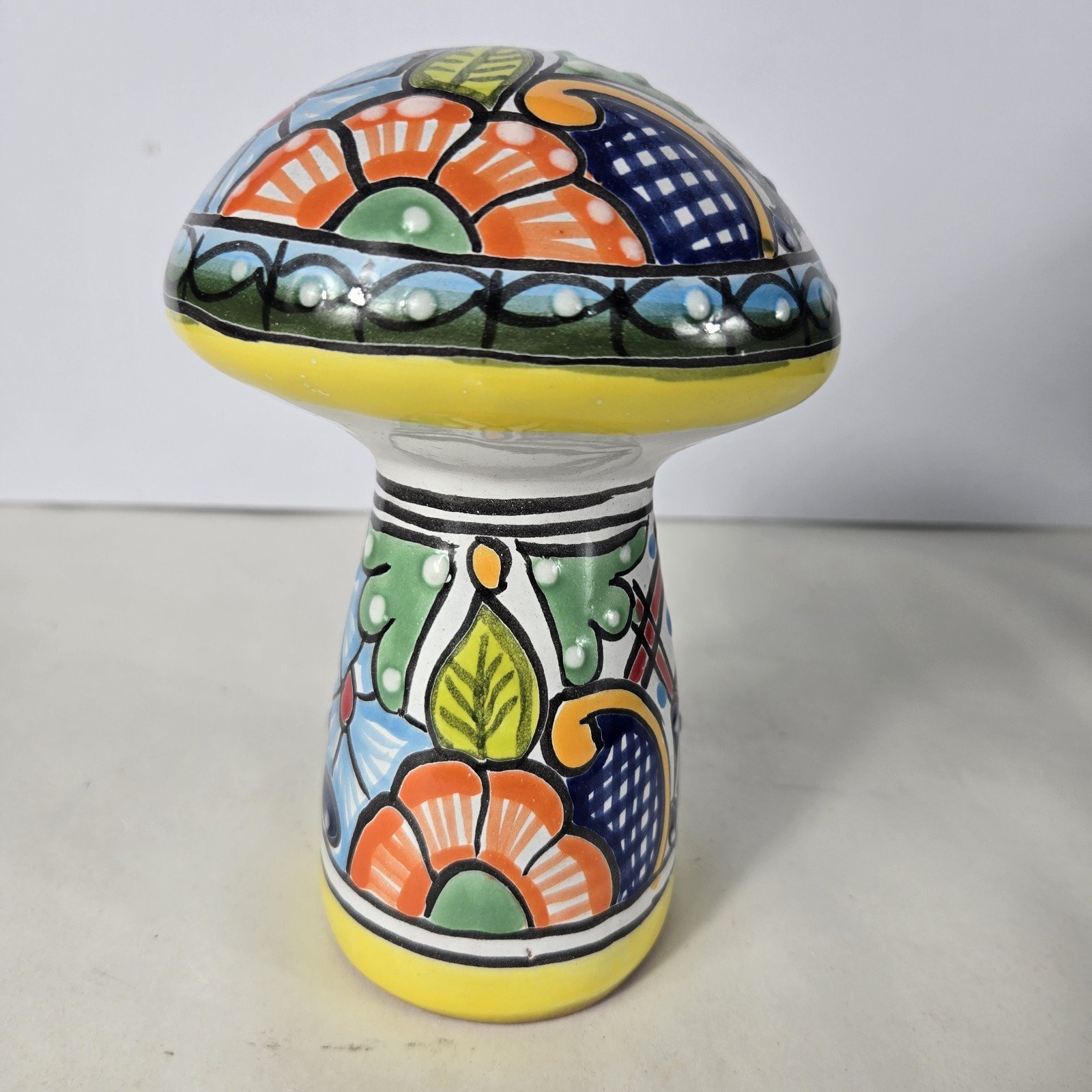 The Talavera Mushroom Mexican Pottery Art Home Decor is a handmade piece of art originating from Mexico. This intricately hand-painted Talavera pottery features vibrant colors and unique designs inspired by Mexican culture. Measuring 6.5 x 4.5 inches, this piece adds a touch of authenticity and charm to any home decor setting, making it a perfect collectible item for those with a love for Latin American craftsmanship.