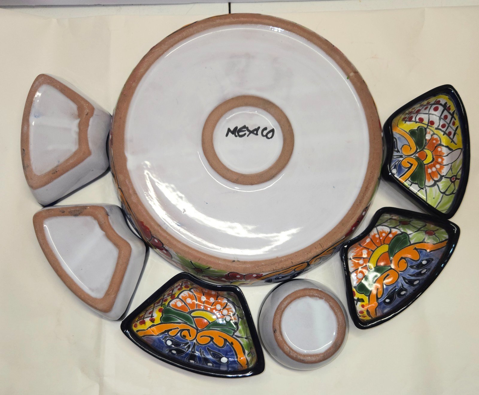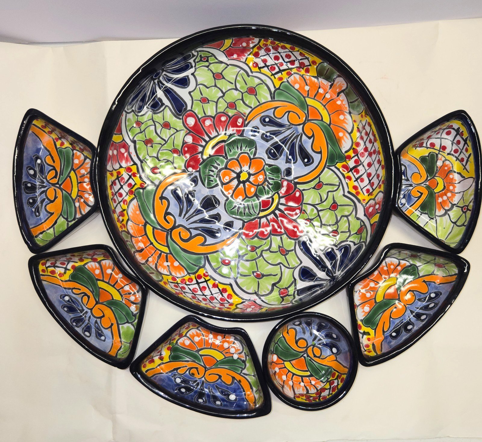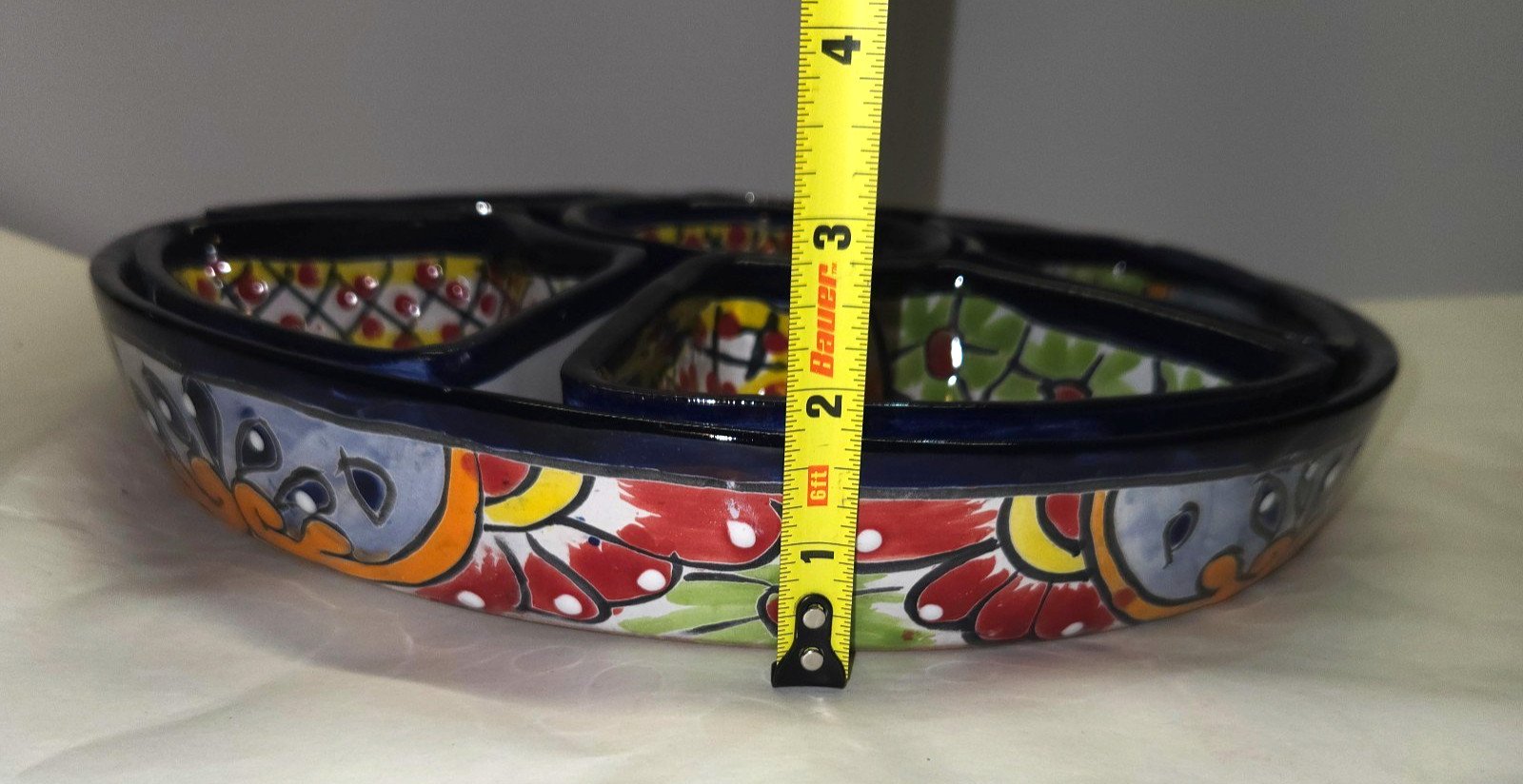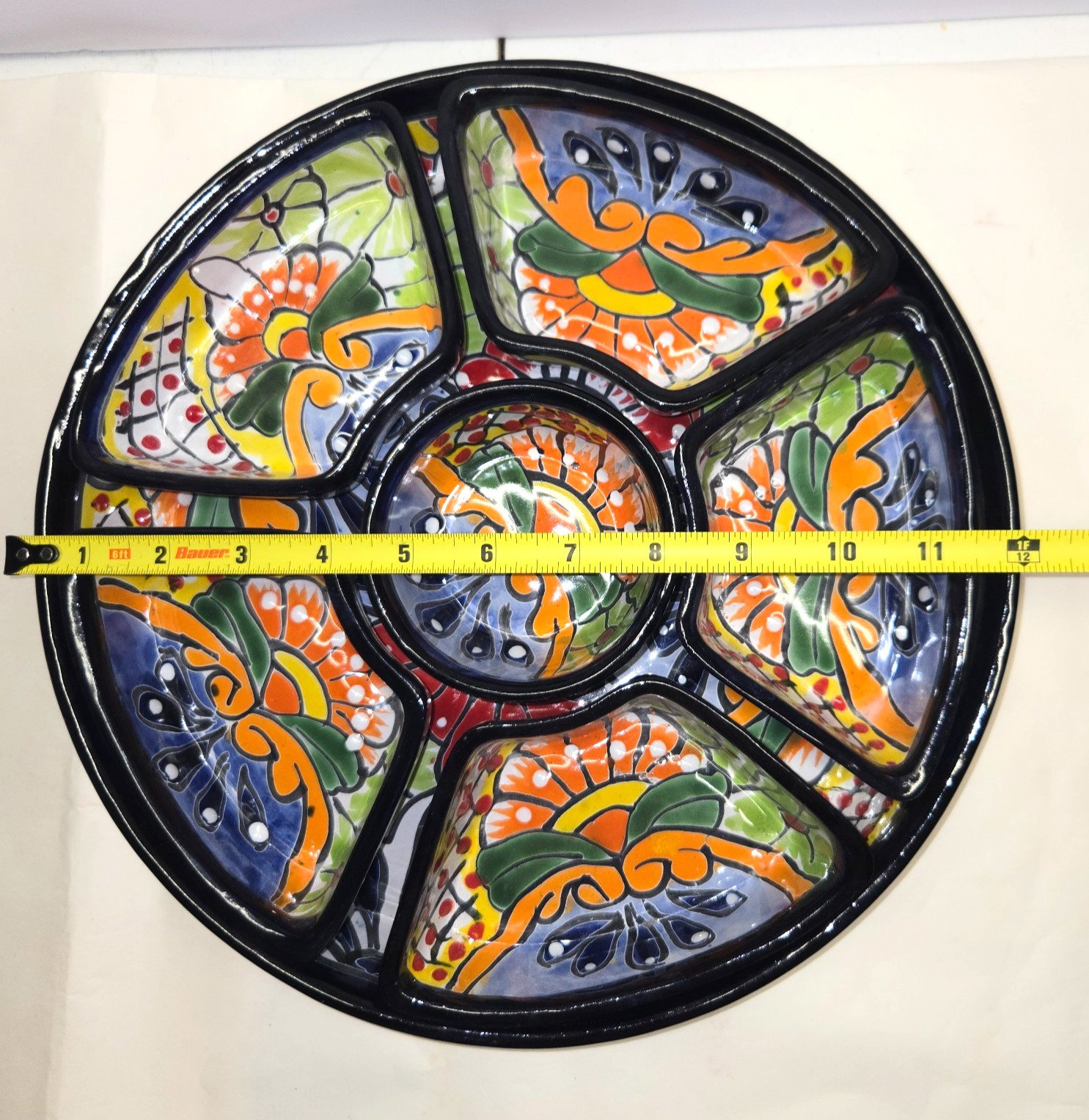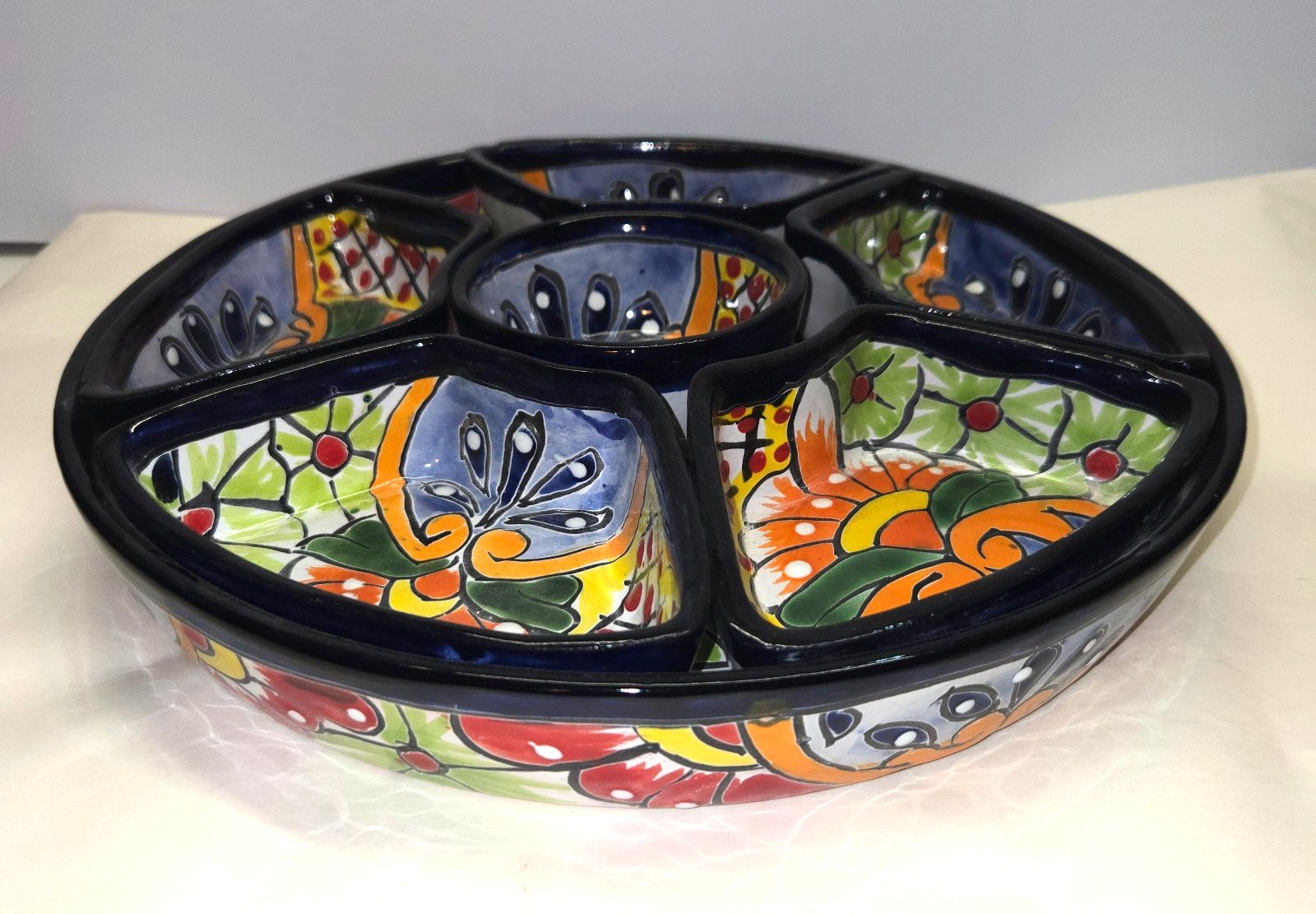This Talavera Pottery Hand Painted Appetizers Salsa Sauce Tray is a beautifully crafted piece from Mexico, showcasing traditional Mexican culture. Measuring 12 x 1 3/4 inches, this unique tray is handmade, making each one truly one-of-a-kind. Perfect for serving salsa or other appetizers, this piece adds a touch of authenticity and charm to any dining table or collection.