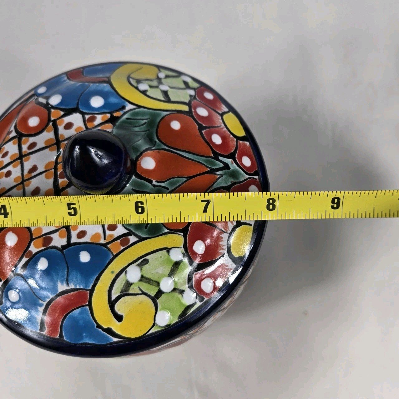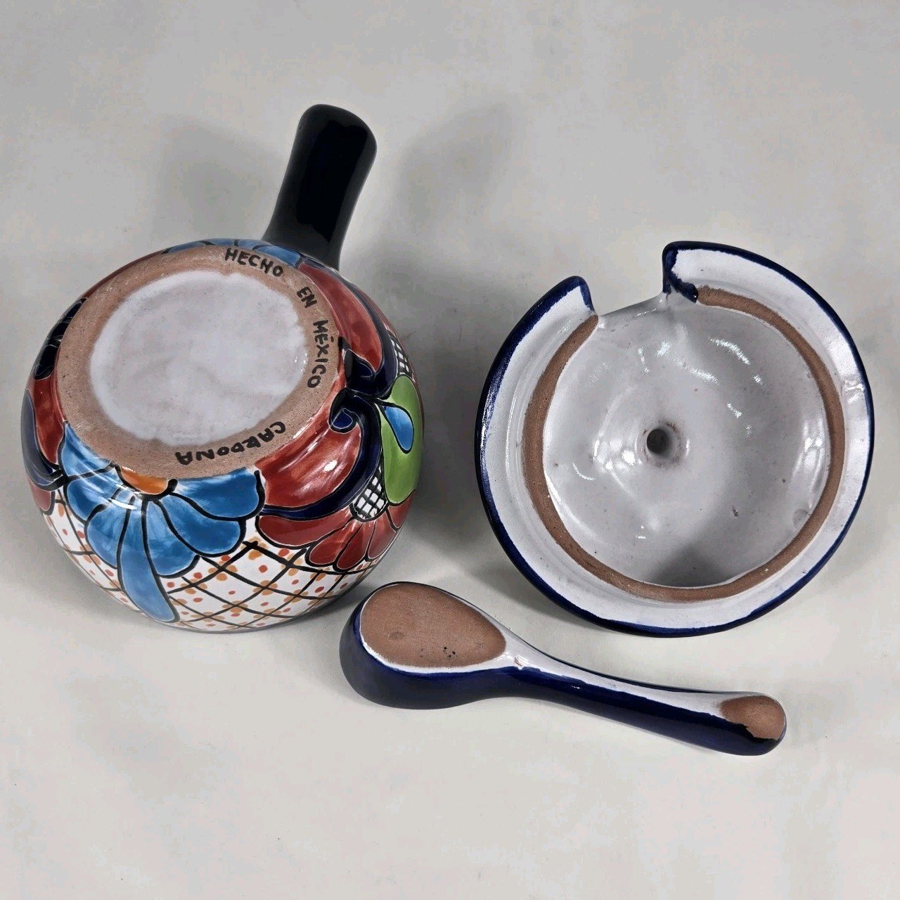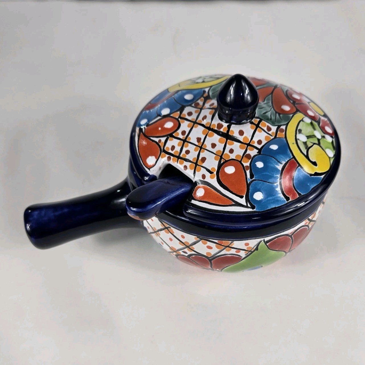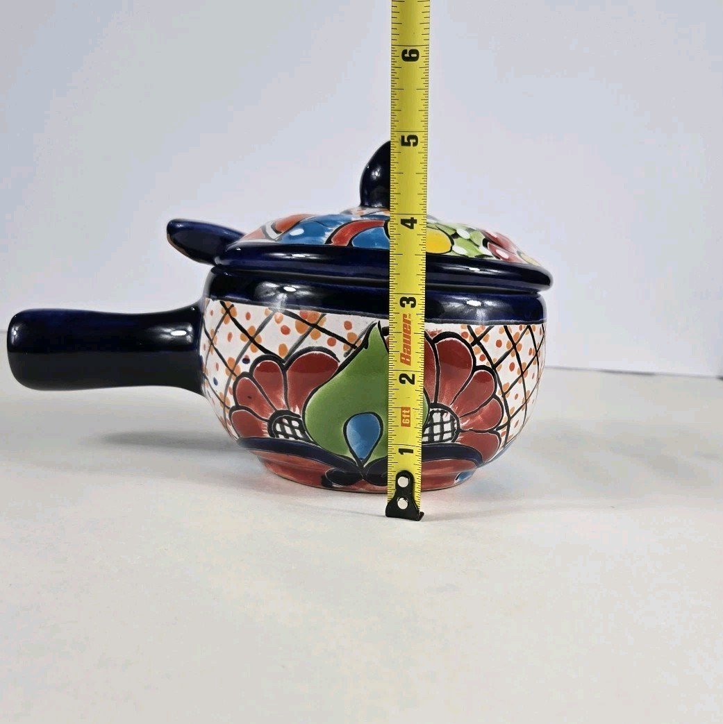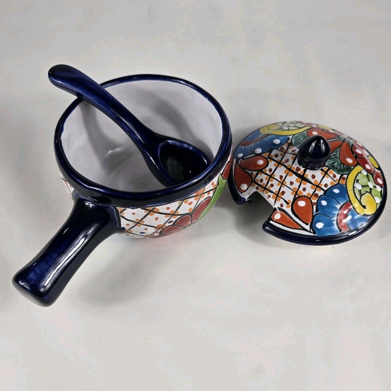 The Talavera Pottery Soup Bowl with Lid and Spoon is a beautifully crafted piece of Mexican art, handmade in Mexico. This unique bowl showcases traditional Mexican culture with intricate designs and colors that are characteristic of Talavera pottery. The 8 x 5" size makes it perfect for serving soup or other dishes, while the lid and spoon provide practicality and convenience. Perfect for collectors or those who appreciate authentic Mexican craftsmanship, this soup bowl is sure to be a standout piece in any kitchen or dining room.