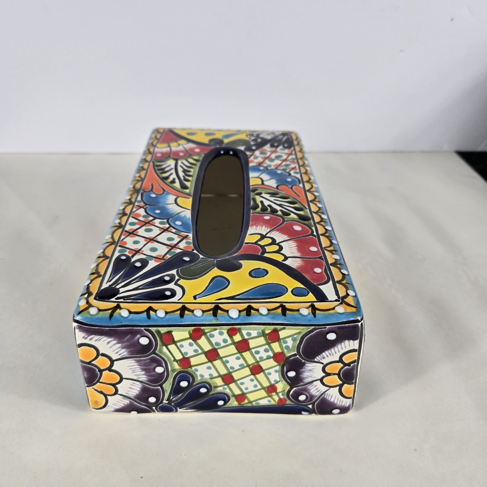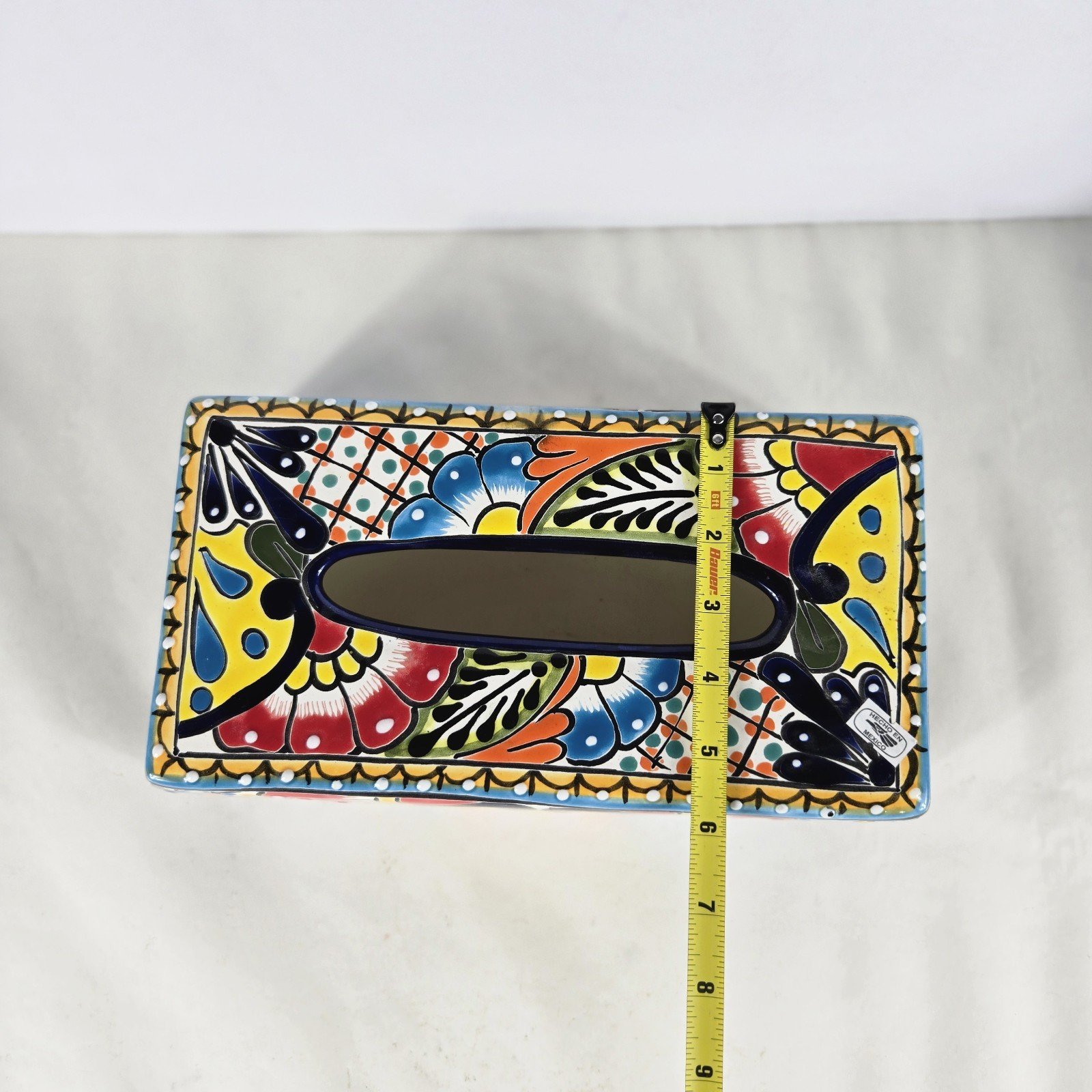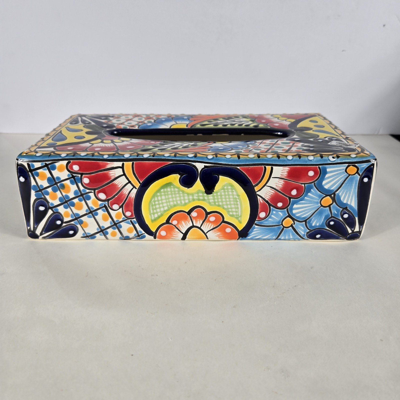 The Talavera Pottery Tissue Box Cover is a handmade piece originating from Mexico, showcasing traditional Mexican artistry. This unique cover adds a touch of authenticity and cultural flair to any kleenex box, making it a charming collectible for those with an appreciation for Latin American pottery. Its intricate design and craftsmanship reflect the rich heritage of Mexican culture, making it a stylish and functional addition to any home decor.