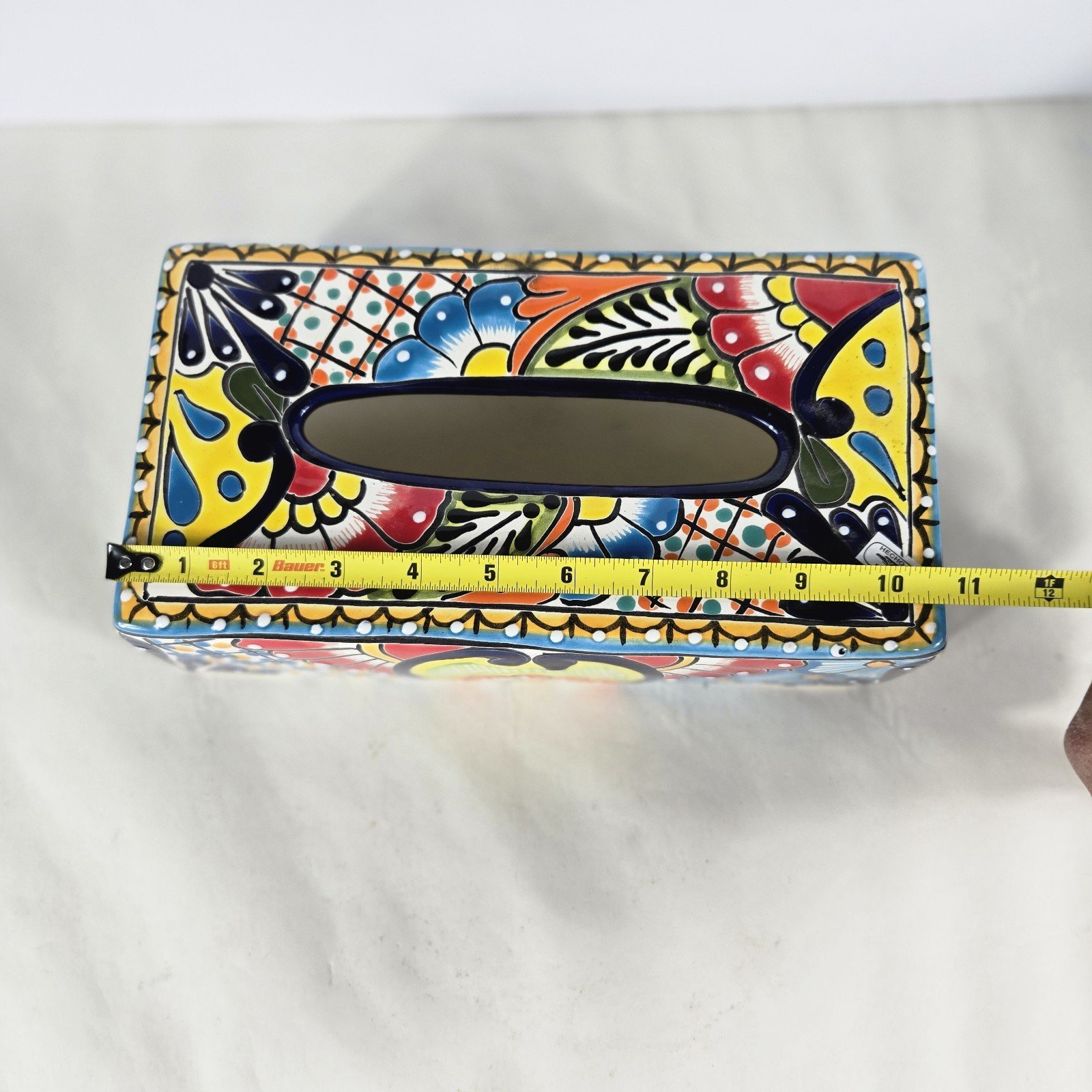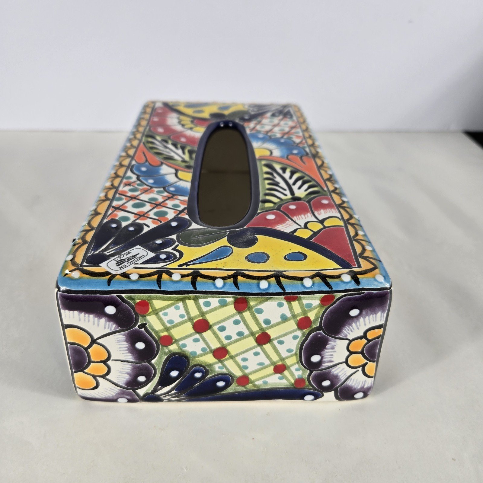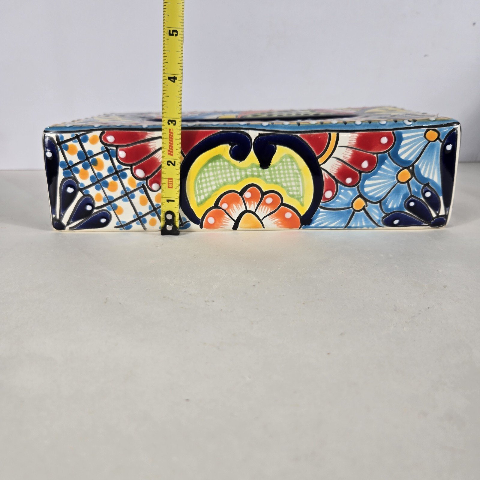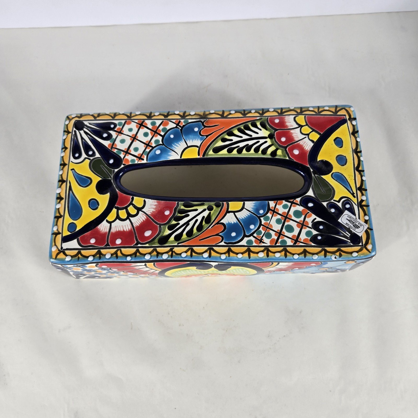 The Talavera Pottery Tissue Box Cover is a handmade piece originating from Mexico, showcasing traditional Mexican artistry. This unique cover adds a touch of authenticity and cultural flair to any kleenex box, making it a charming collectible for those with an appreciation for Latin American pottery. Its intricate design and craftsmanship reflect the rich heritage of Mexican culture, making it a stylish and functional addition to any home decor.