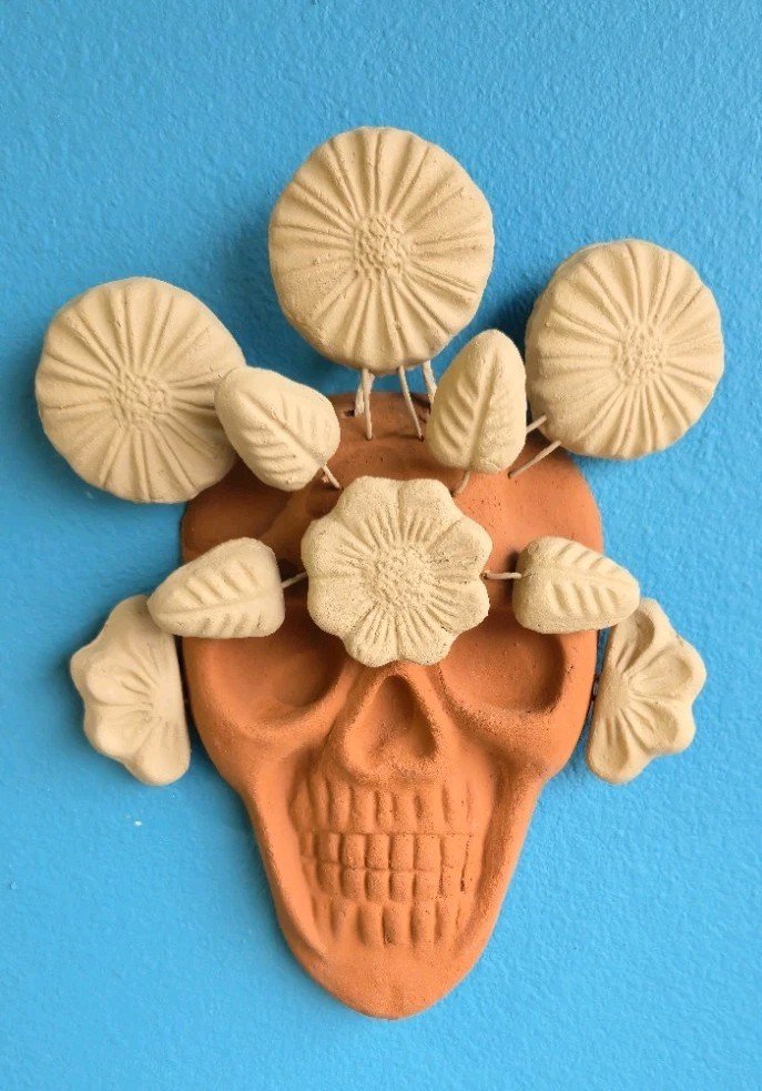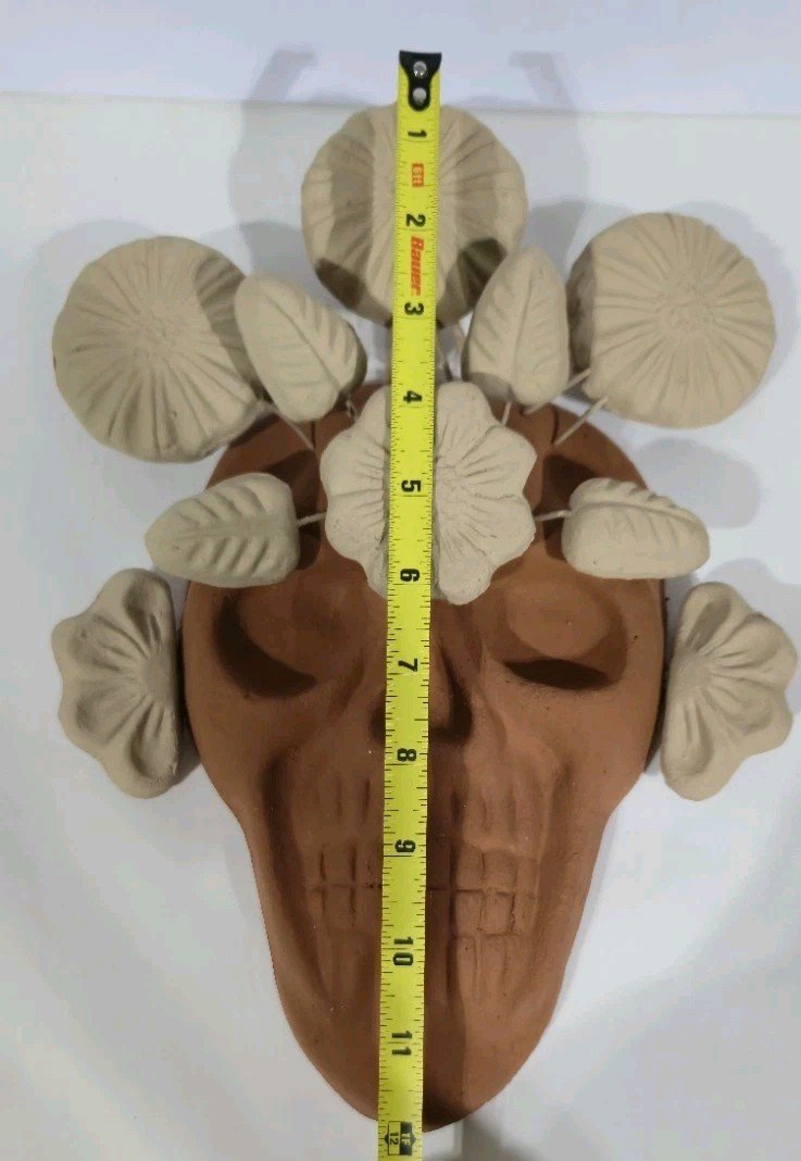 This product is a handmade terracotta wall skull measuring 9 x 12 inches, originating from Mexico. It showcases Mexican art and culture, making it a unique and authentic collectible item. The intricate design and craftsmanship of this piece make it a standout piece for those interested in Latin American pottery and artwork.