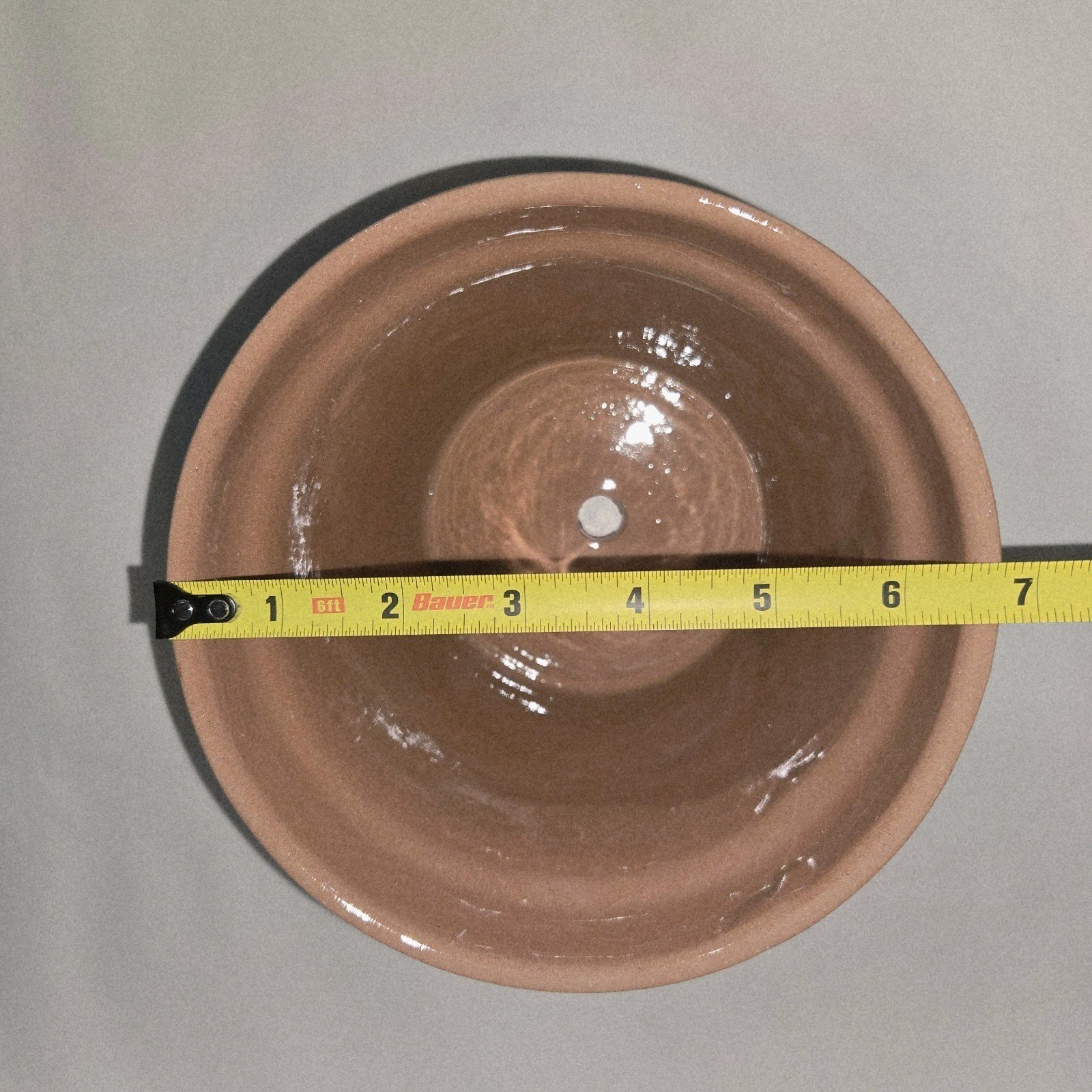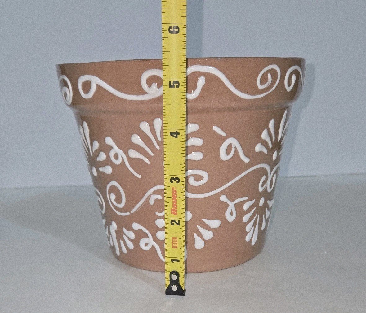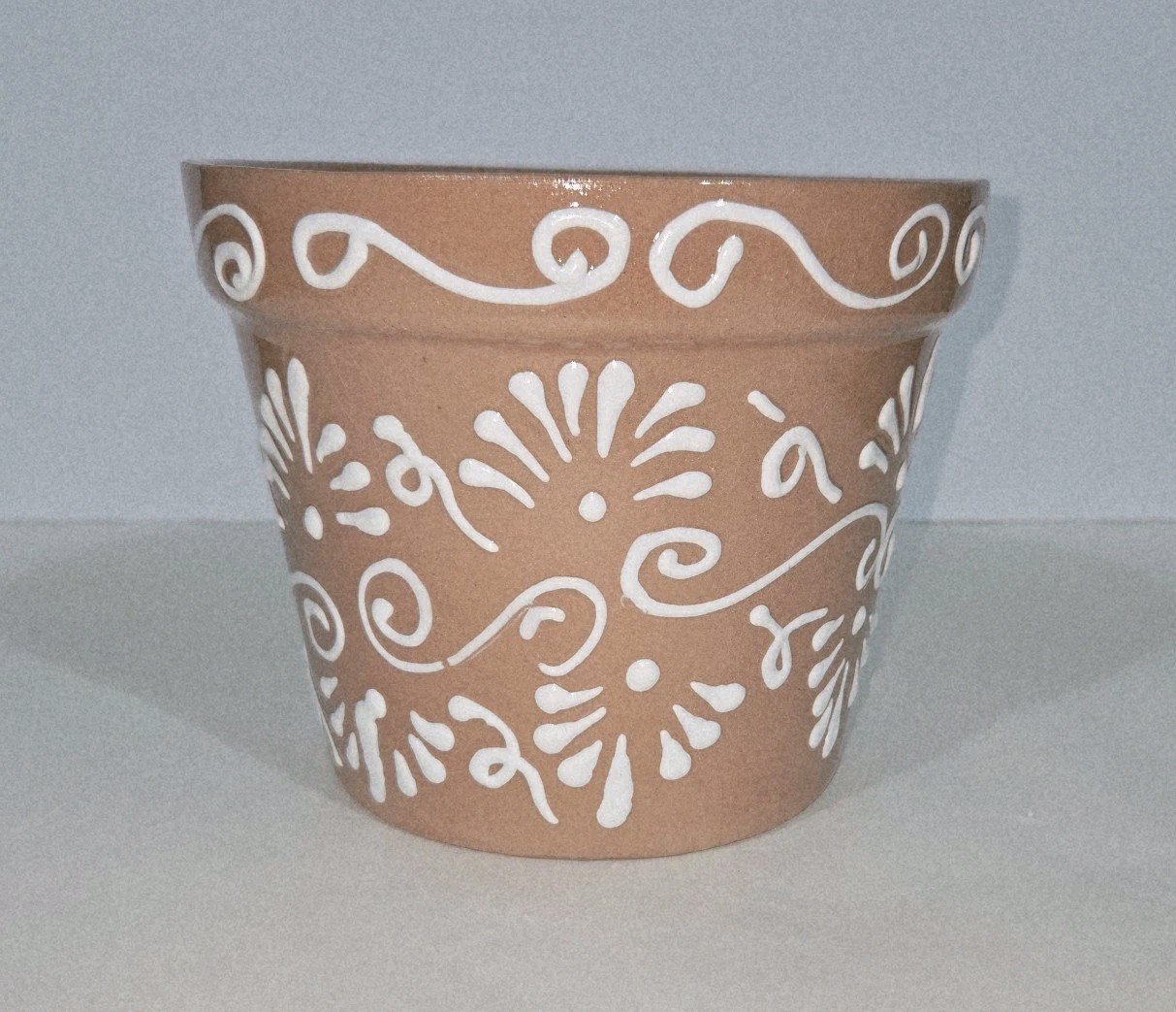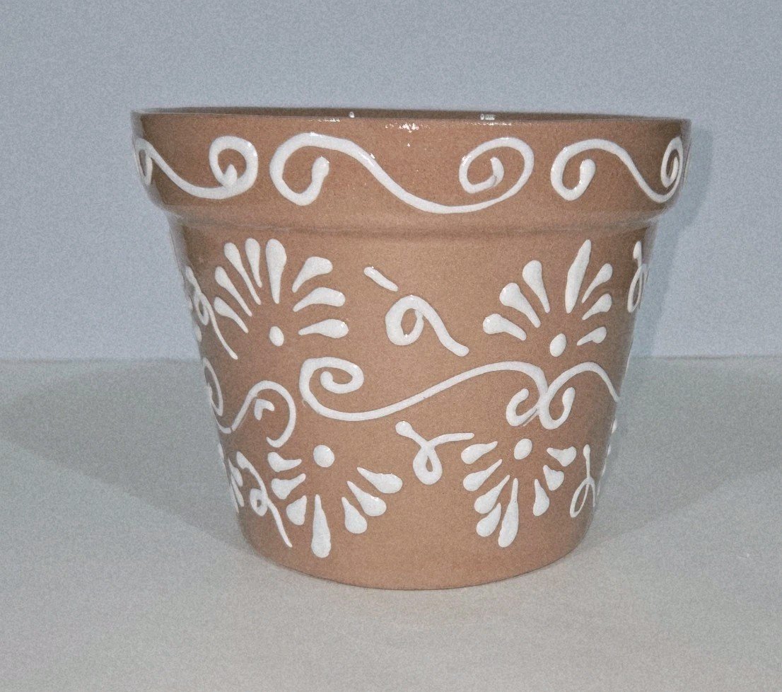This product is a hand-painted Mexican terracotta planter measuring 7 x 5.5 inches tall. The design features a white-on-terracotta color scheme, typical of Mexican artistry. Made in Mexico, this piece reflects the rich cultural heritage and craftsmanship of the region, making it a unique and collectible item for those interested in Latin American pottery.
